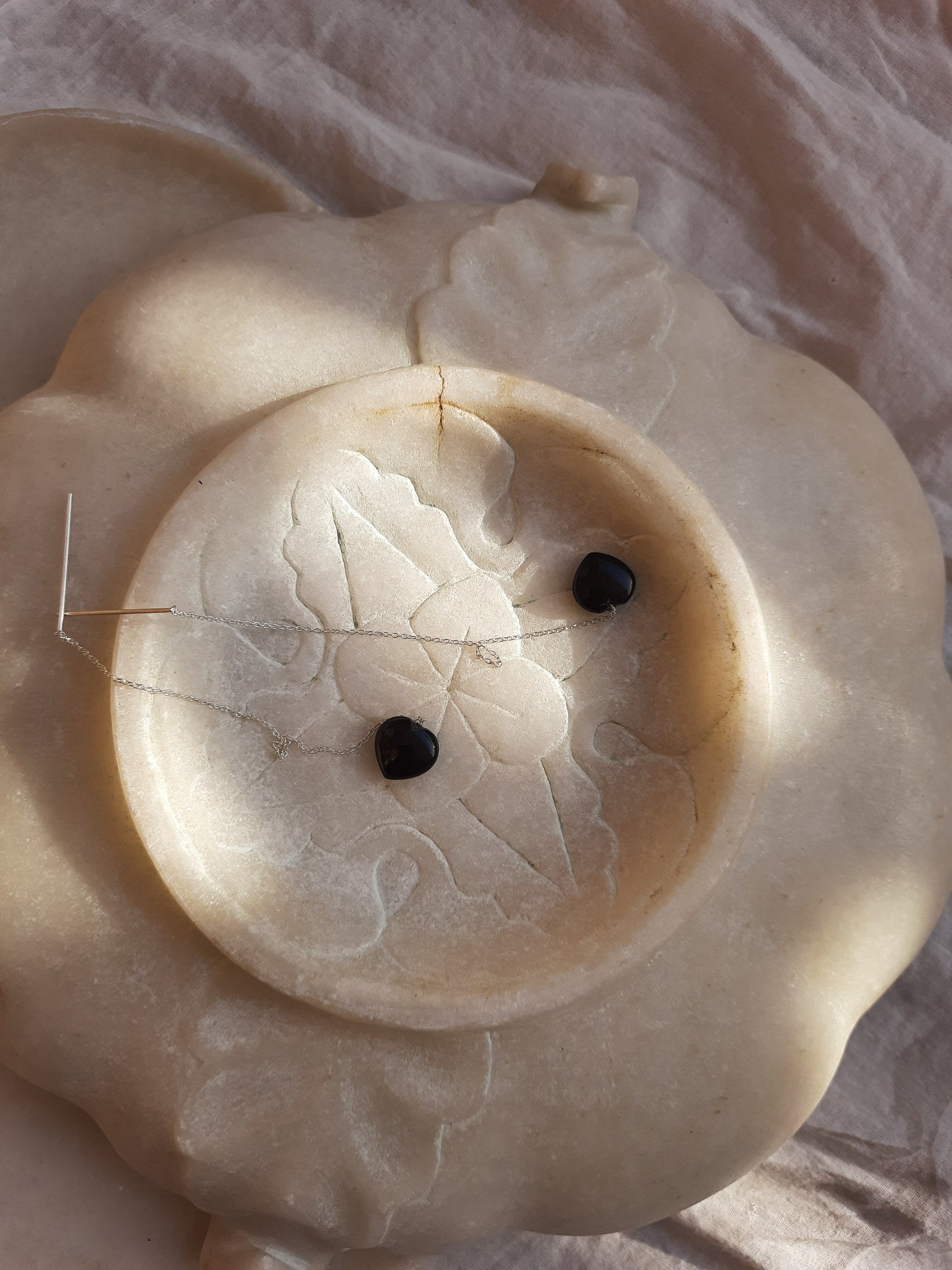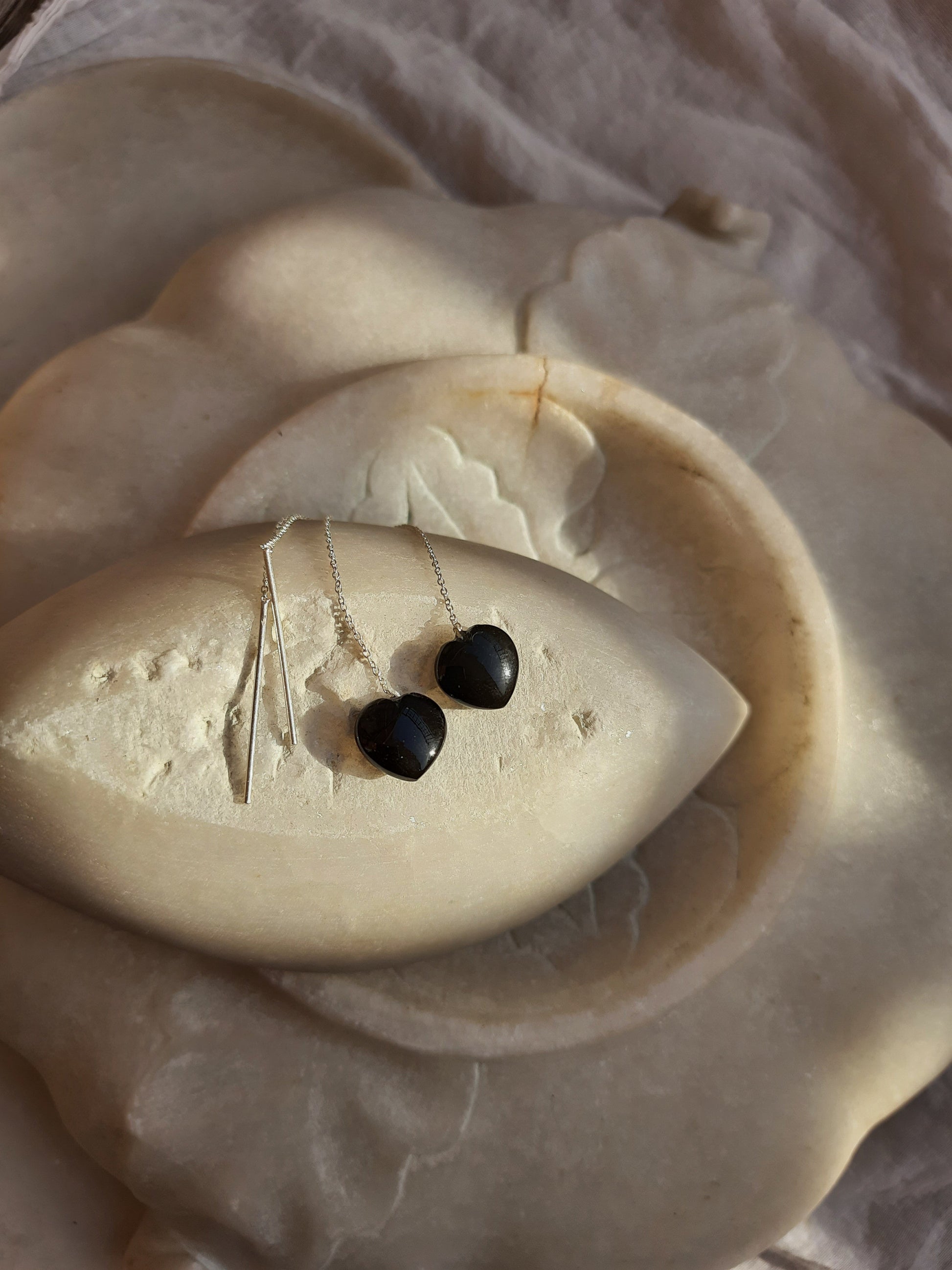 Black Onyx Heart Threader Earrings with Sterling Silver chain.