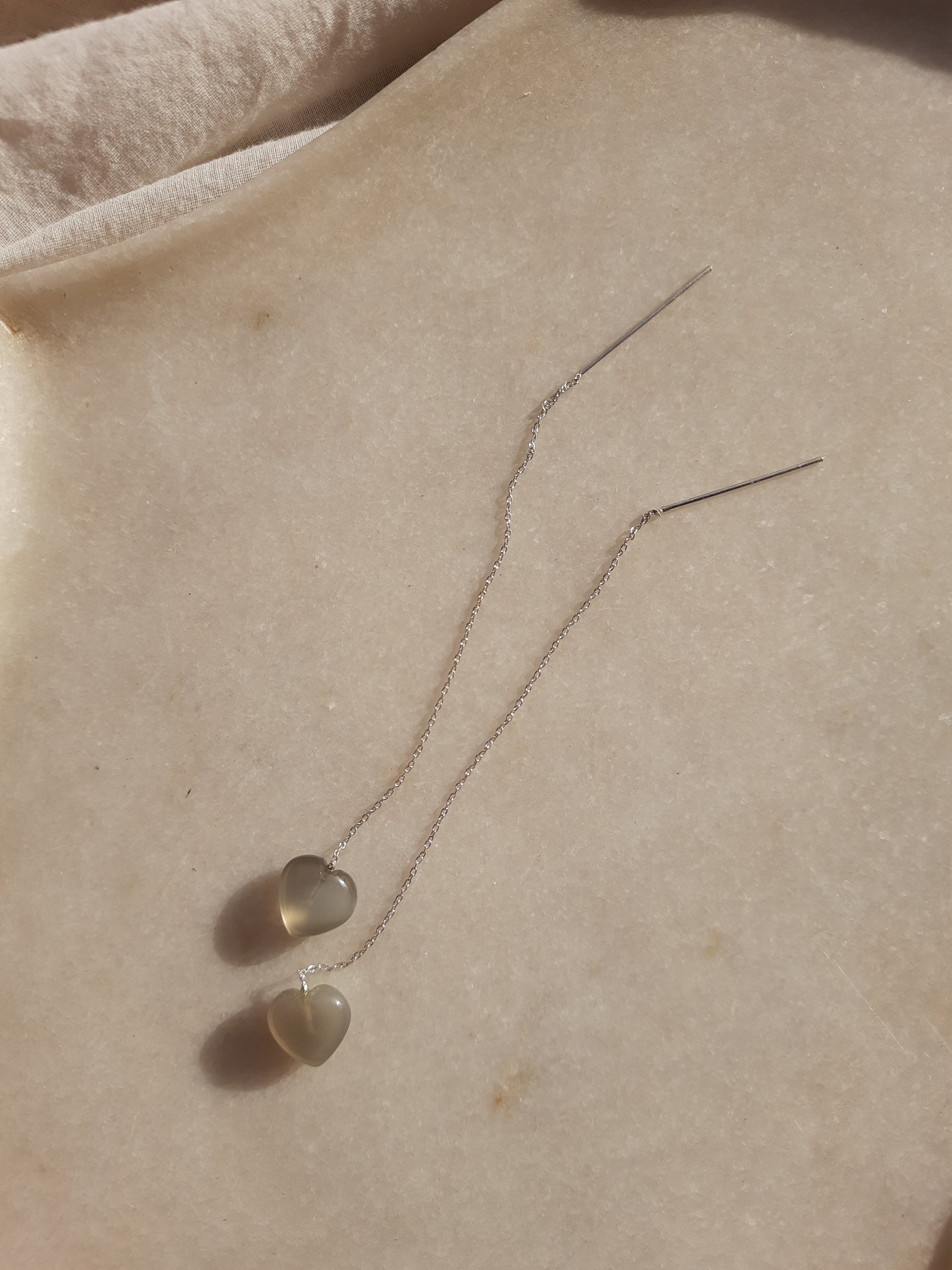 These earrings are made from fine quality Grey Moonstone gemstone, was hand carved in a heart shape of size 12 mm and finished using Sterling Silver/14kt Gold Plated on Brass findings.
