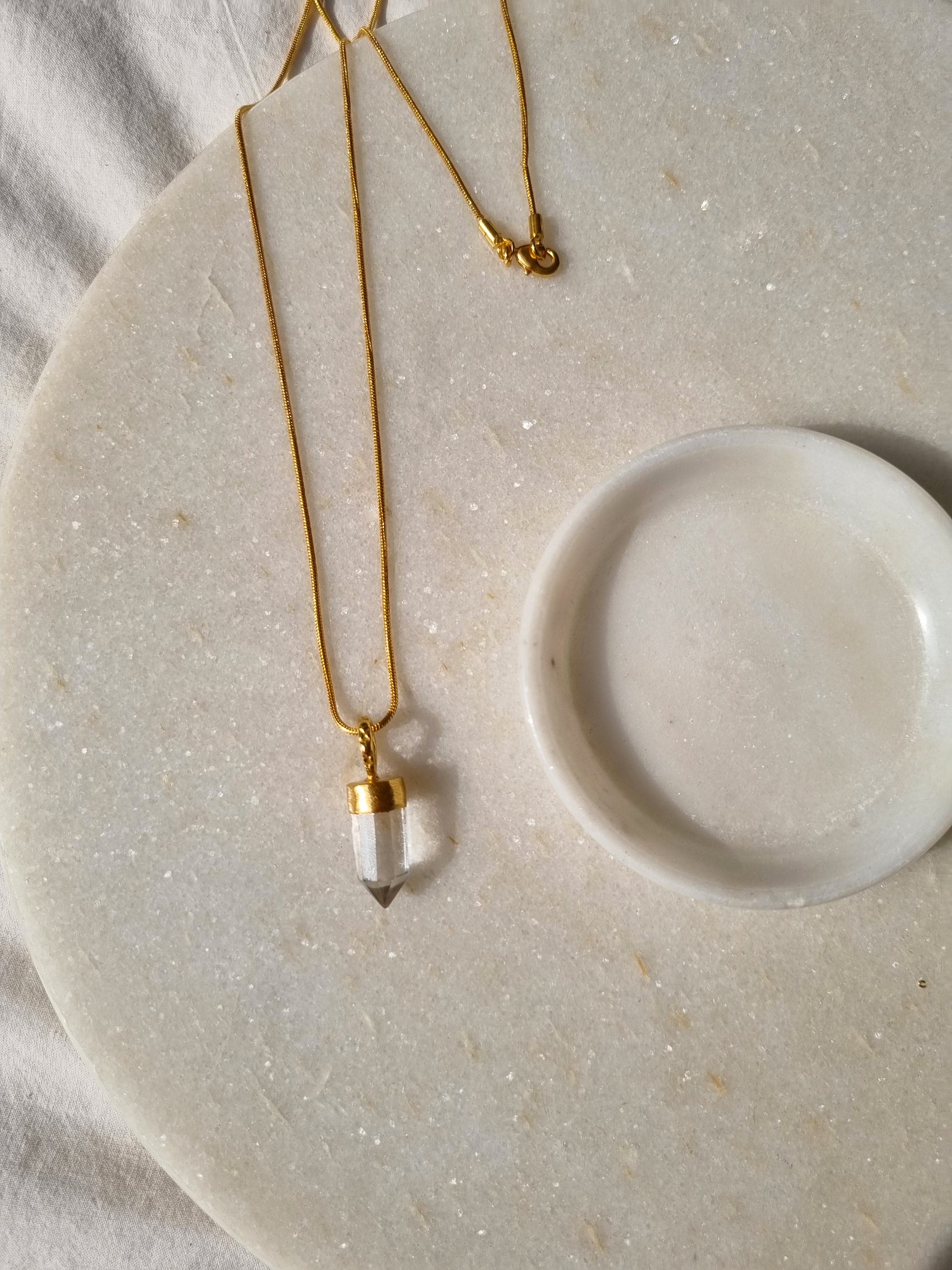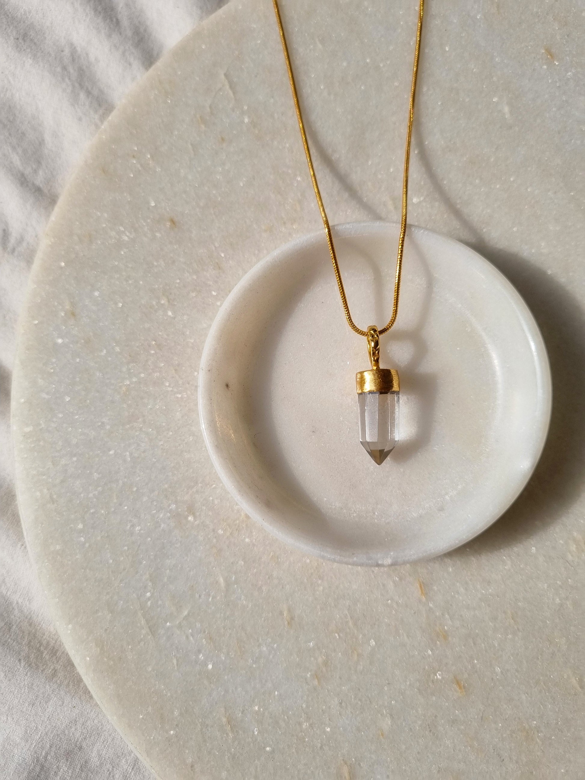This crystal pendant is made from fine quality Clear Quartz gemstone, was hand carved in a Arrow shape and finished using 14kt Gold Plated on Brass findings.