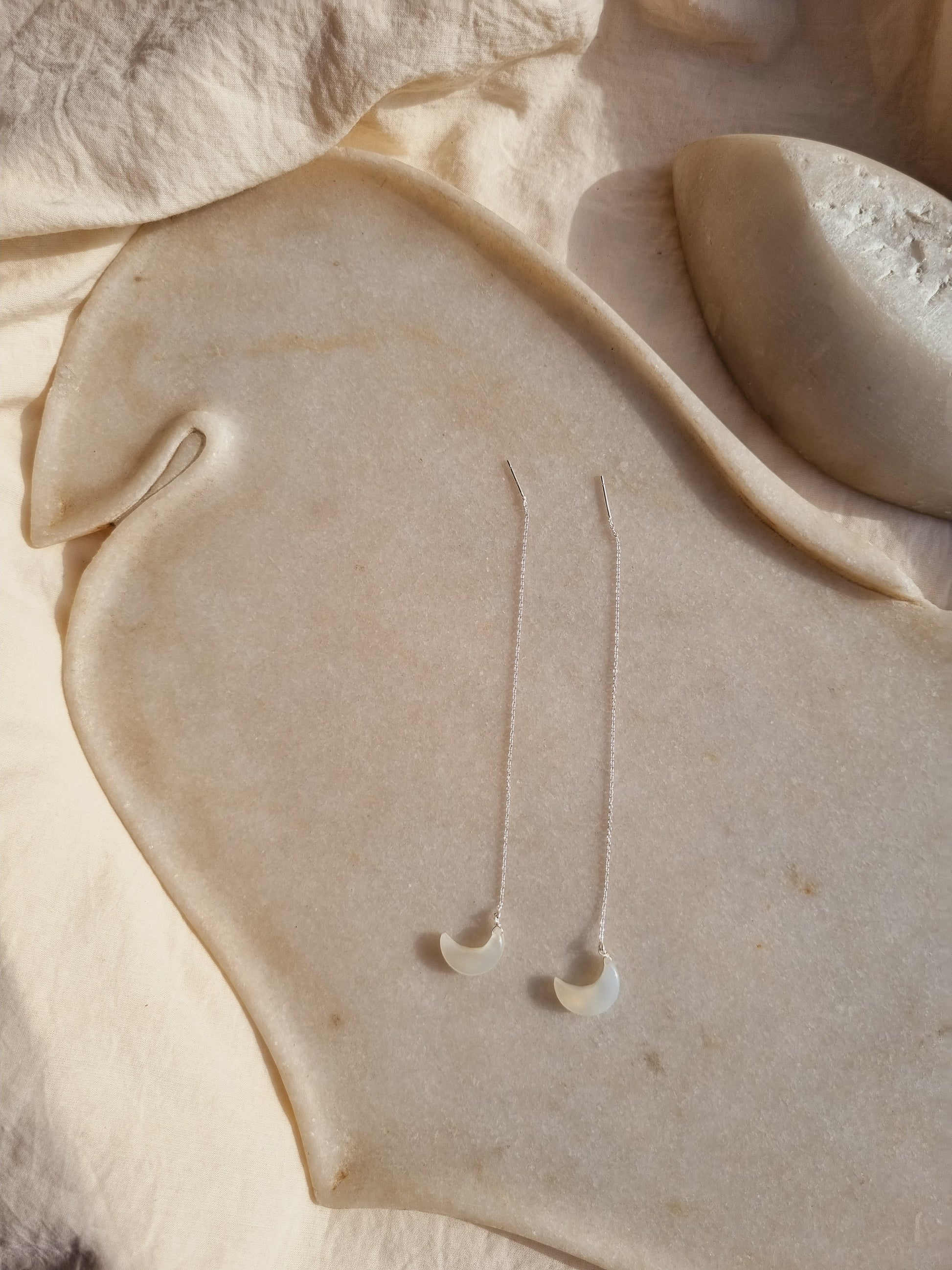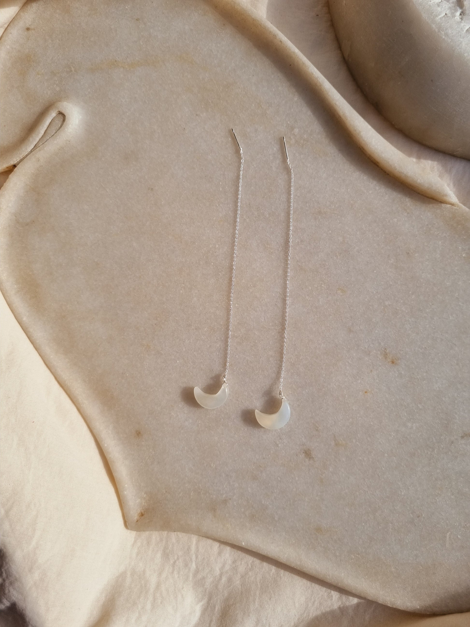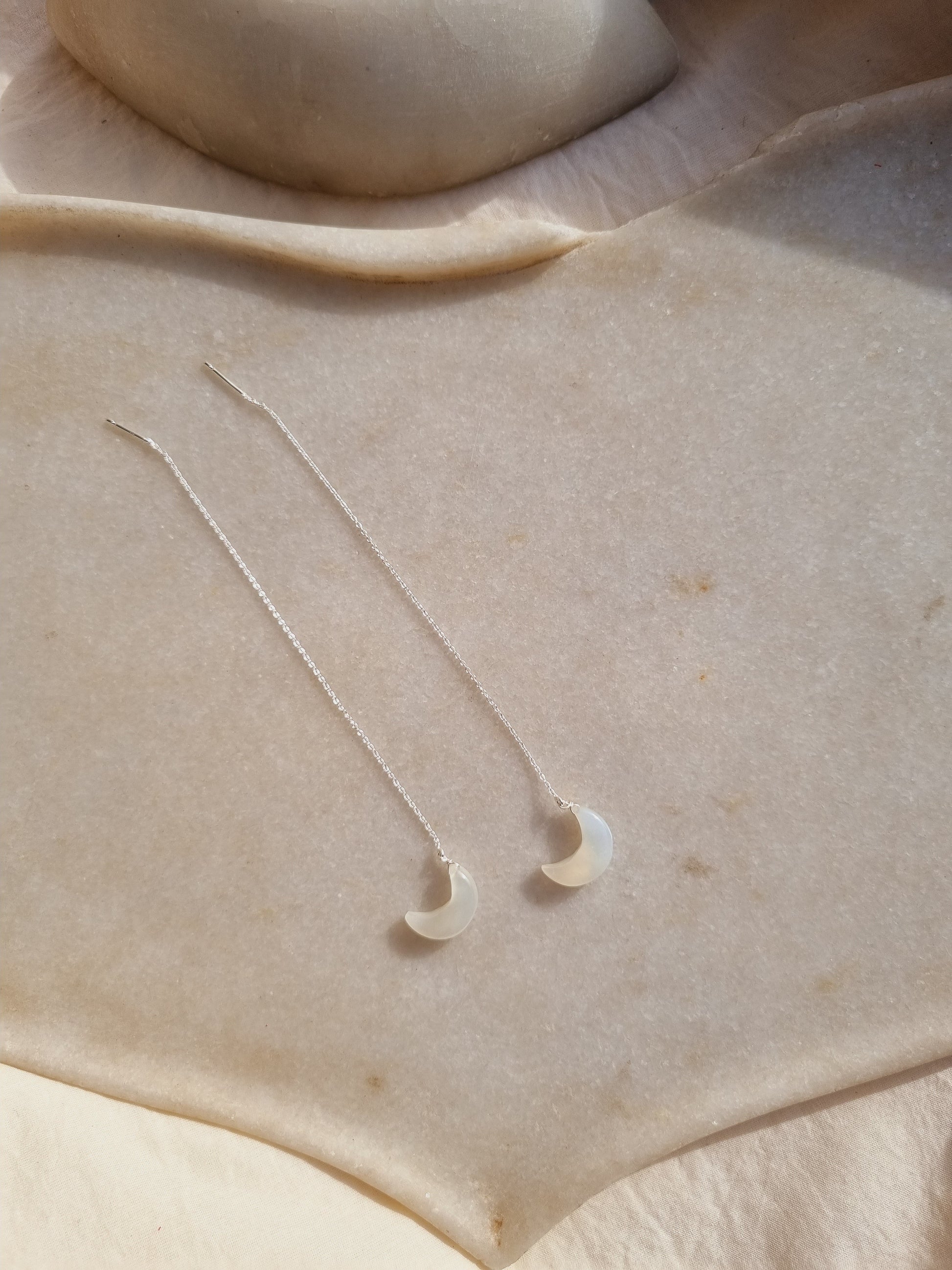 White Moonstone Luna Moon Threader Earrings with 14kt Gold Plated on Brass/Sterling Silver chain.