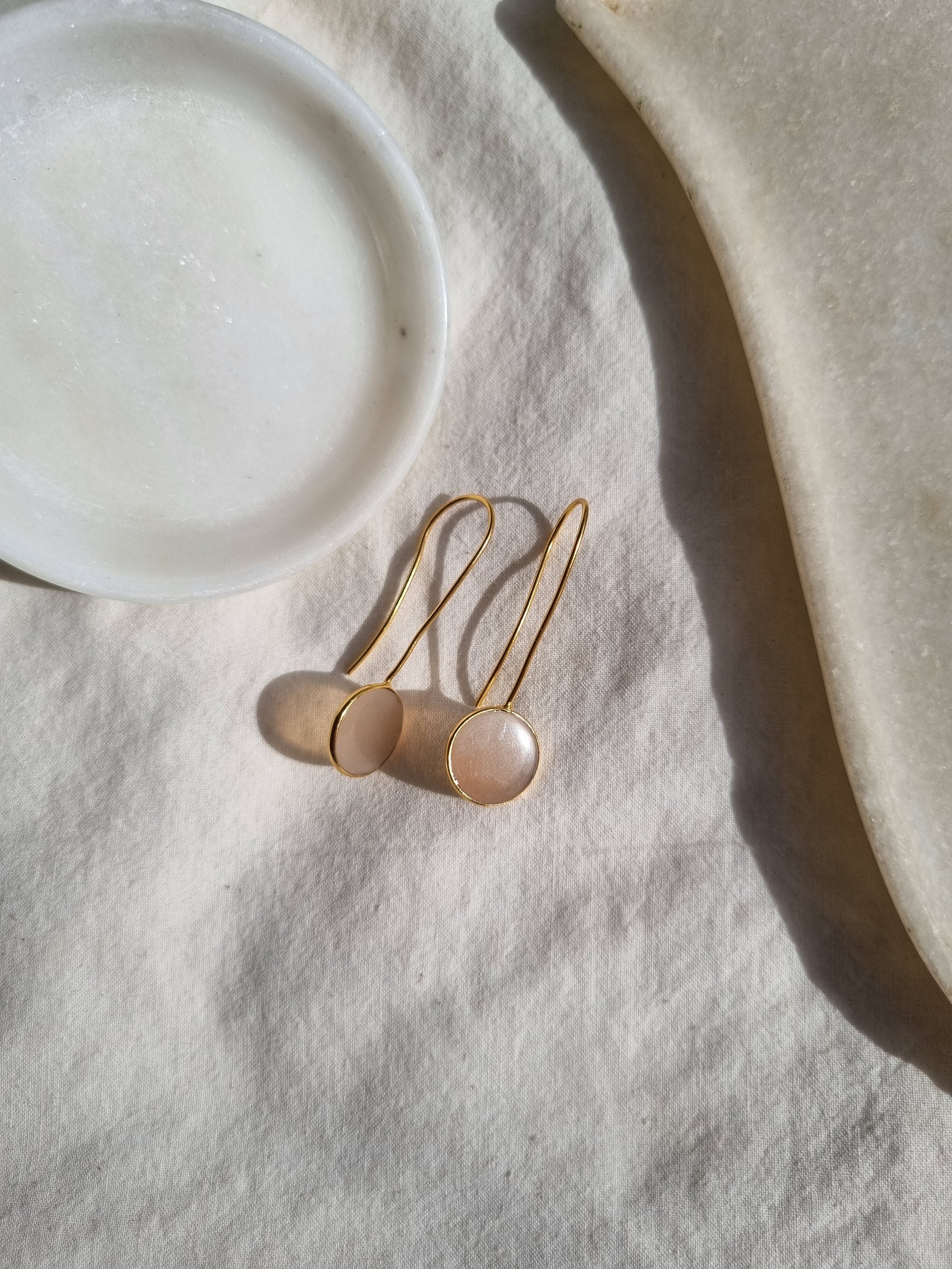 These earrings are made from fine quality Peach Moonstone gemstone, was hand carved in a round shape and finished using 14kt Gold Plated on Brass findings.