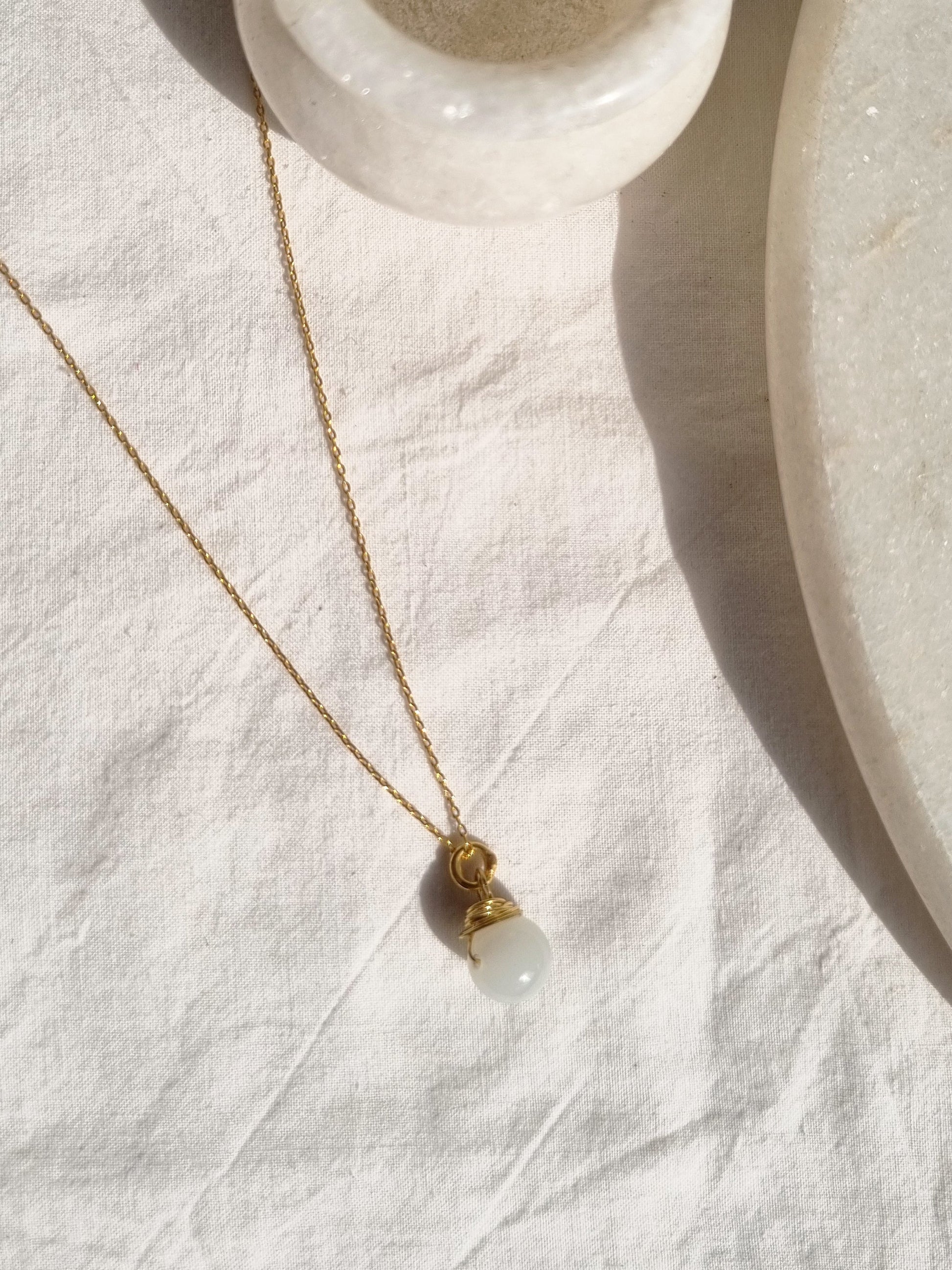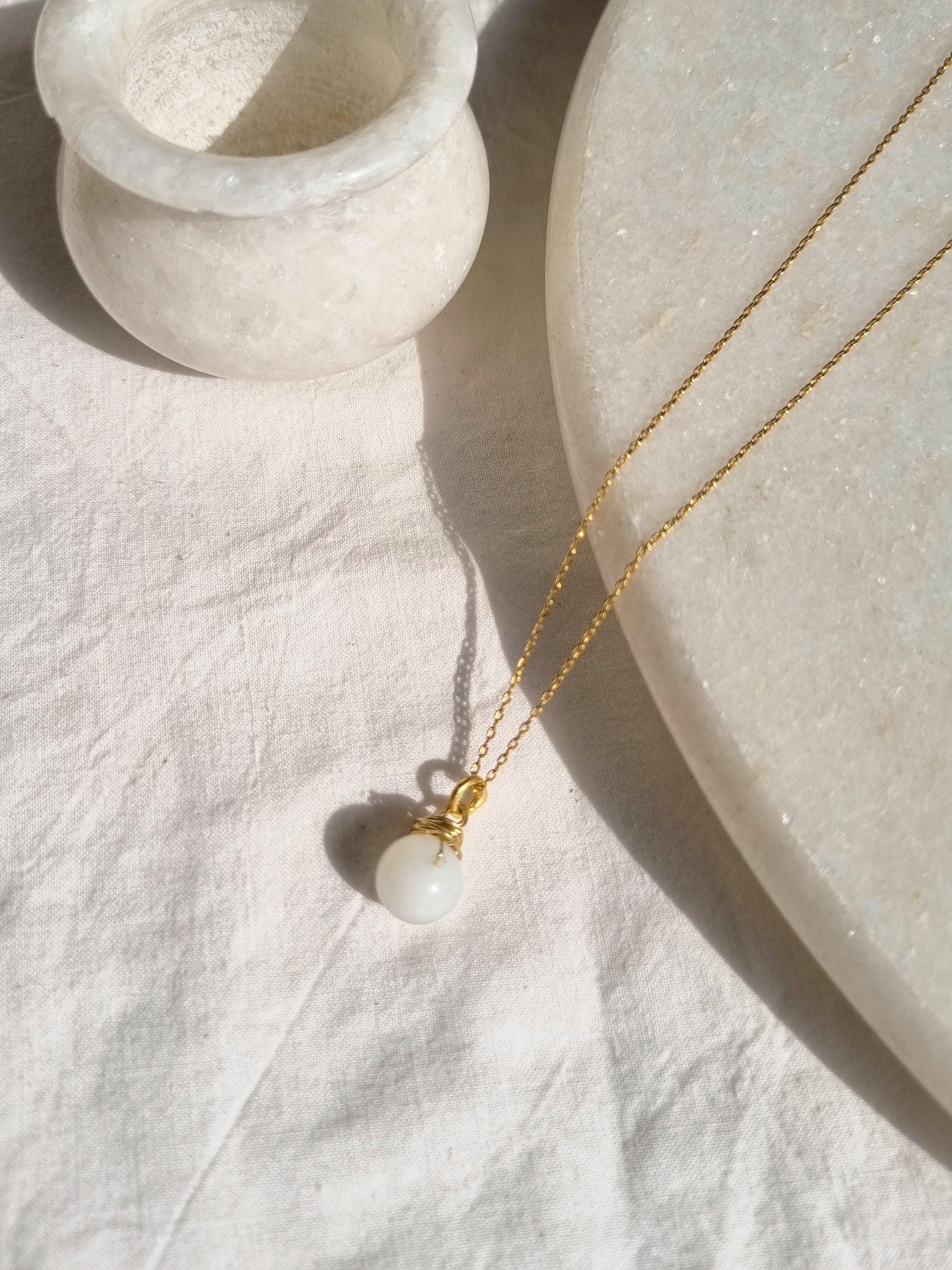 White Moonstone Round Pendant with 14kt Gold Plated on Brass/Sterling Silver chain.