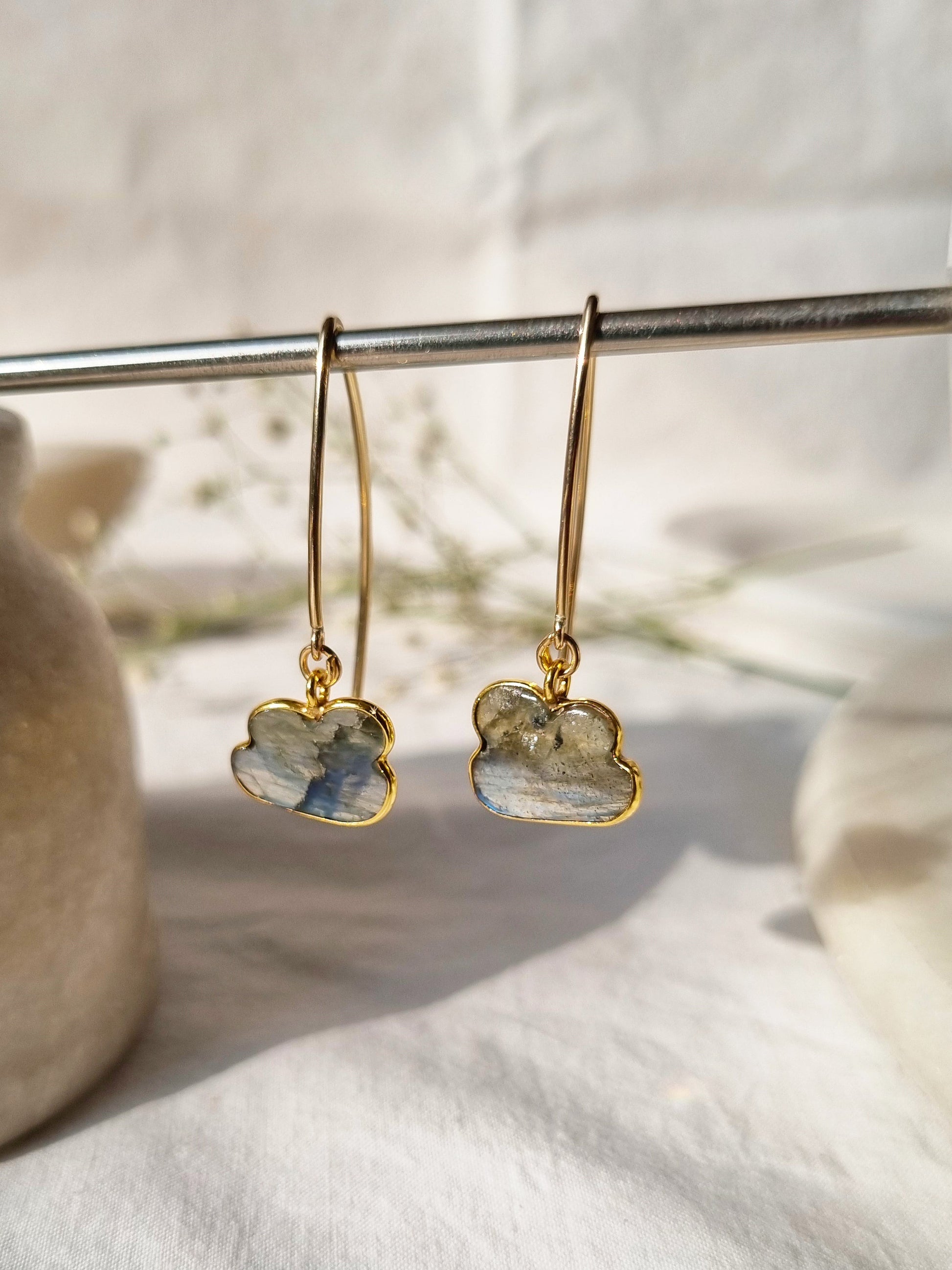 These crystal earrings are made from fine quality Labradorite gemstone, was hand carved in a cloud shape and finished using 14kt Gold plated on brass marquise ear wire.