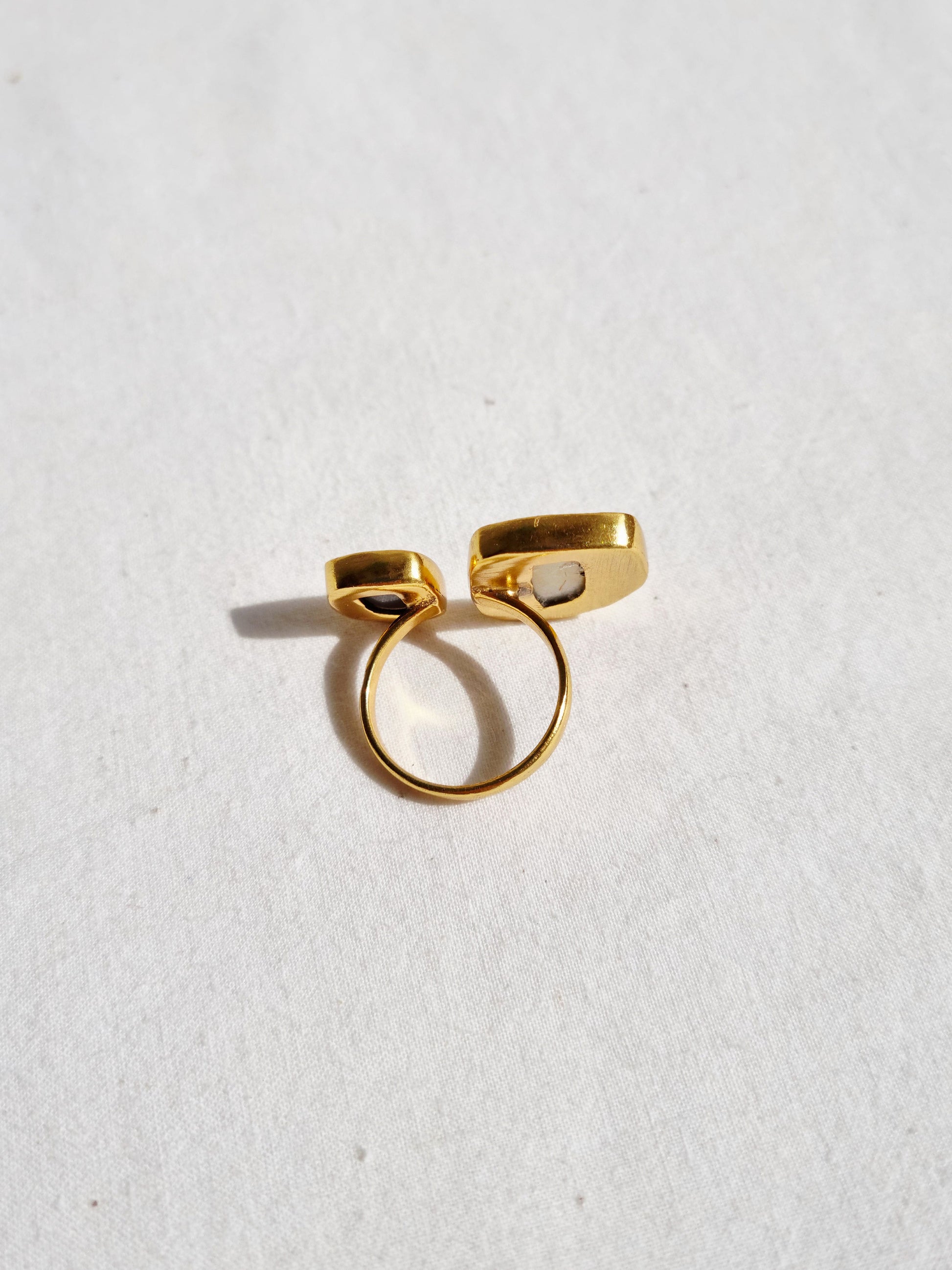 This crystal ring is made from fine quality Mother of Pearl & Black Onyx gemstone, was hand carved in a irregular shape and finished using adjustable 14KT Gold plated brass.