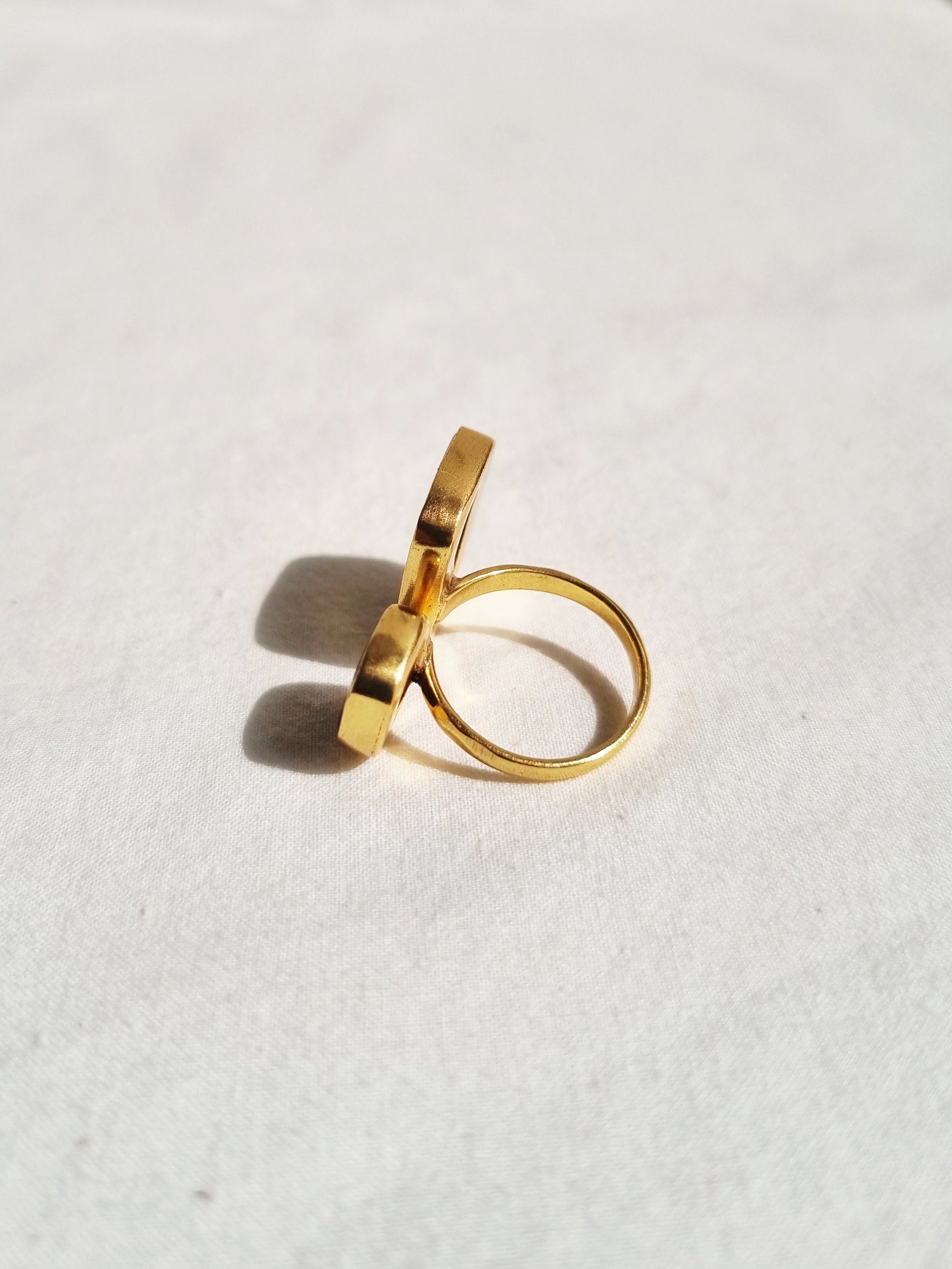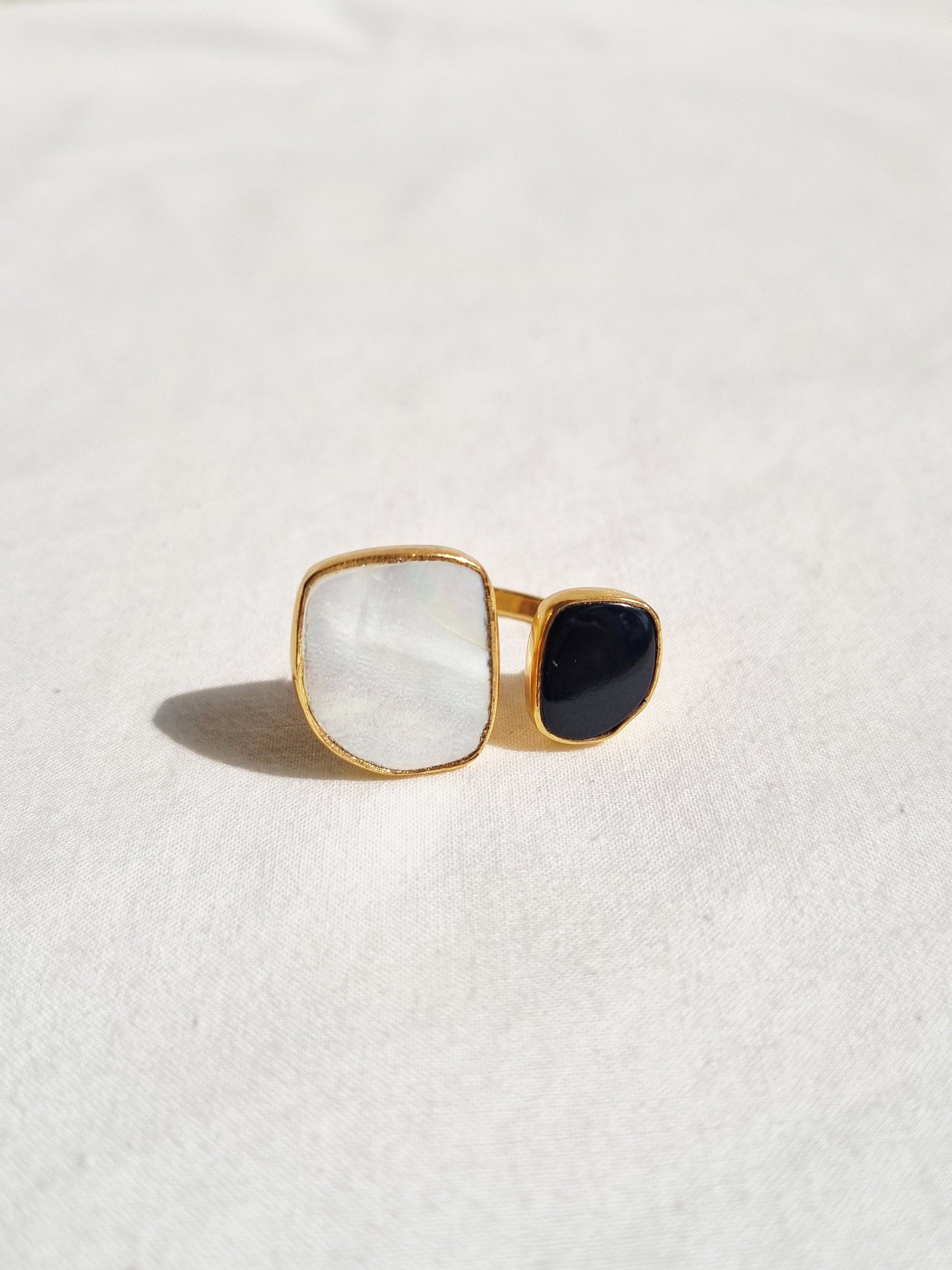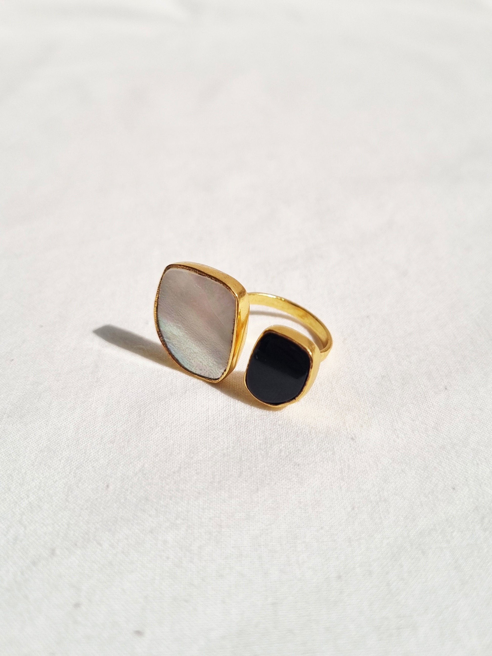 Mother of Pearl & Black Onyx adjustable Ring finished with 14KT Gold Plated Brass.