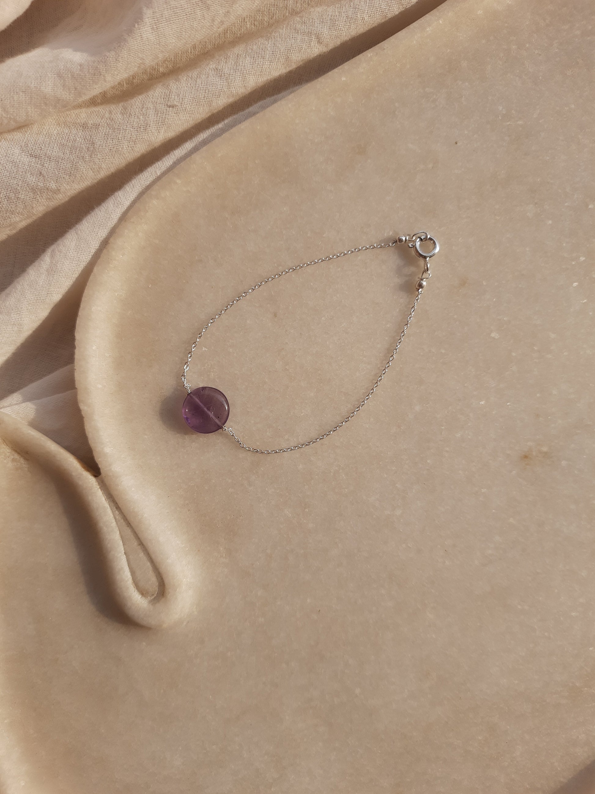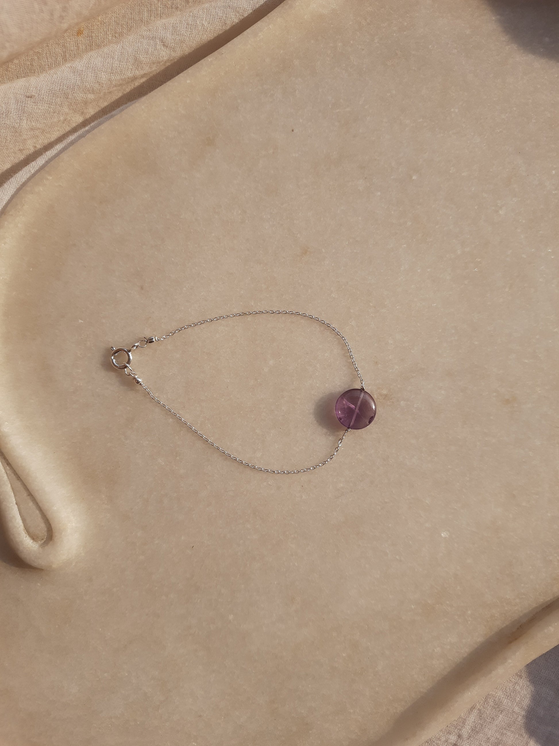 This crystal bracelet is made from fine quality lavender Amethyst gemstone, and was hand carved in a round shape and finished using 14kt Gold Plated on Brass / Sterling Silver findings.