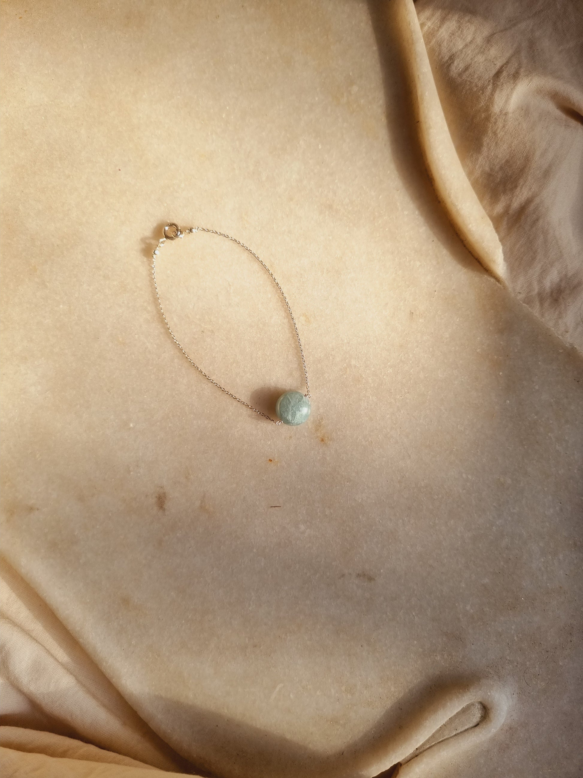 This bracelet is made from fine quality Aquamarine gemstone, and was hand carved in a round shaped bead and finished using 14kt Gold Plated on Brass / Sterling Silver findings.