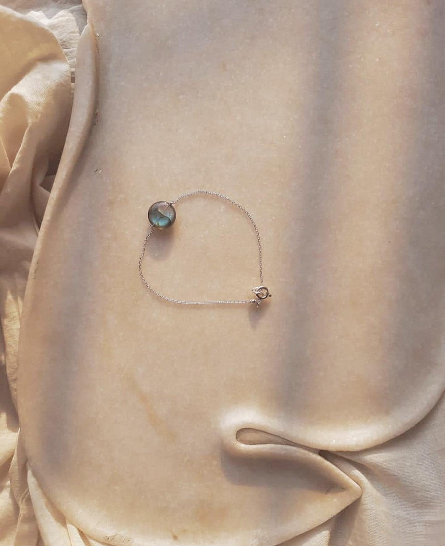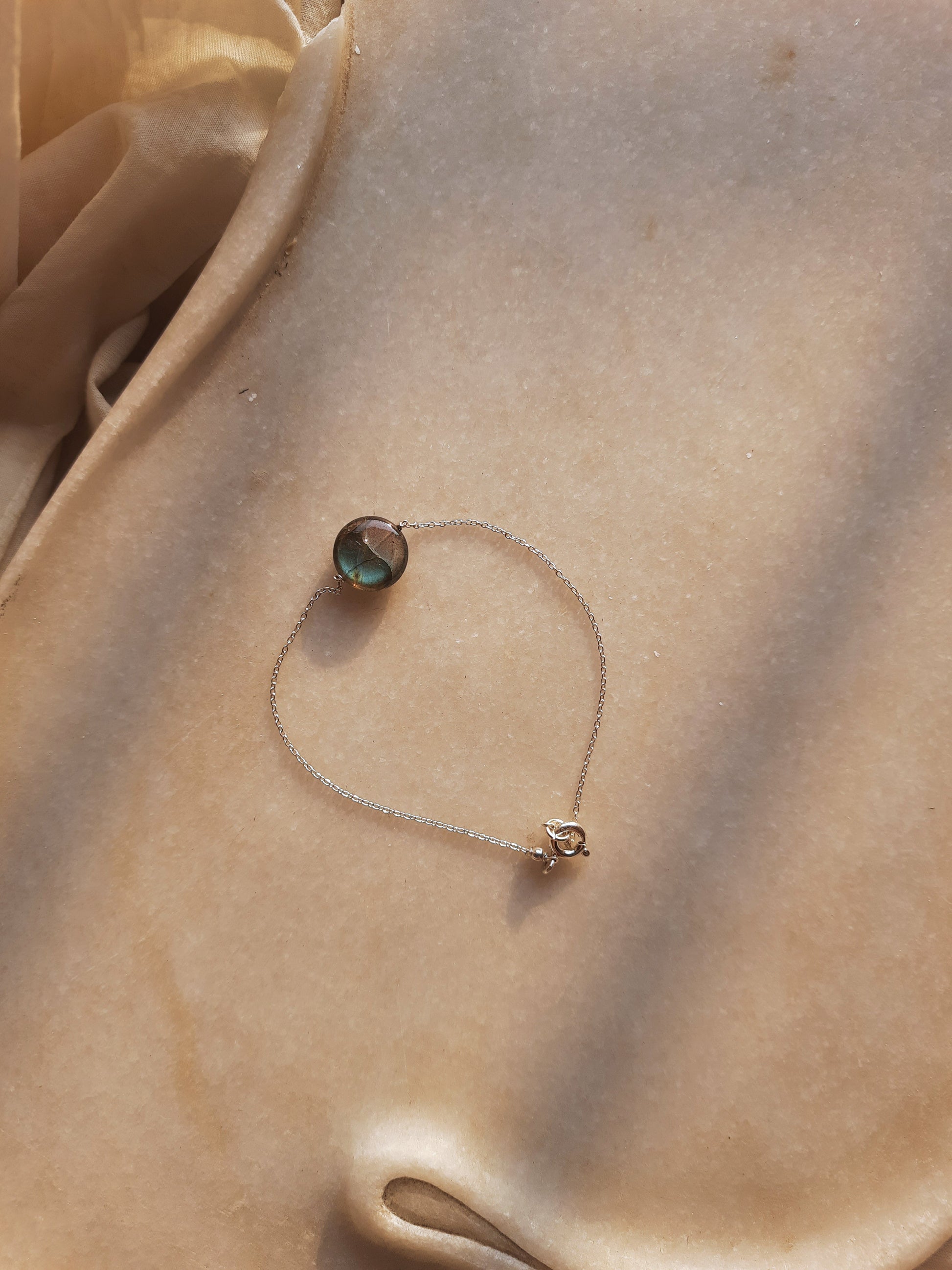 This bracelet is made from fine quality Labradorite gemstone, and was hand carved in a round shaped bead and finished using 14kt Gold Plated on Brass / Sterling Silver findings.