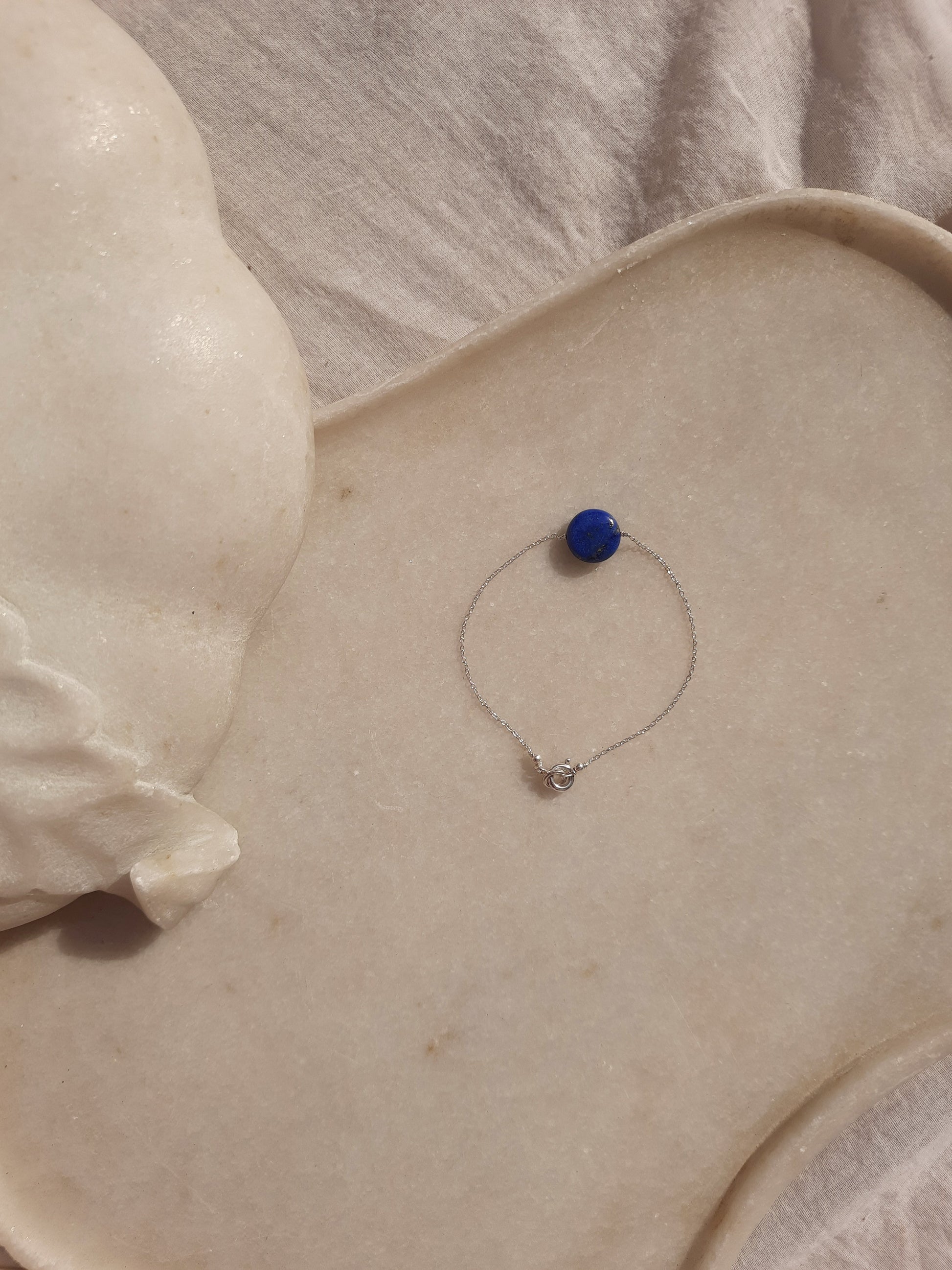 This bracelet is made from fine quality blue lapis lazuli gemstone, and was hand carved in a round shaped bead and finished using 14kt Gold Plated on Brass / Sterling Silver findings.