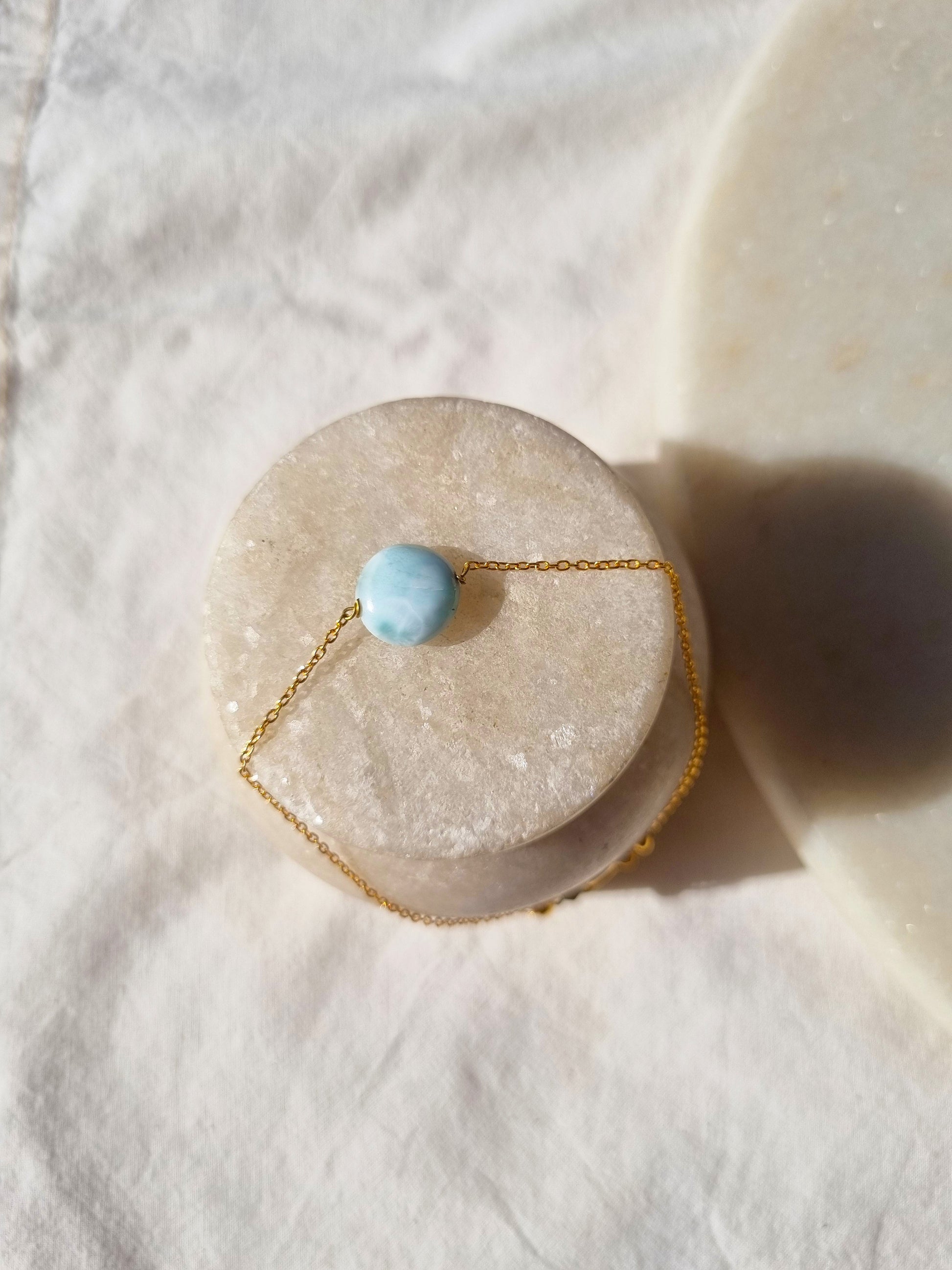 This bracelet is made from fine quality Larimar gemstone, and was hand carved in a round shaped bead and finished using 14kt Gold Plated on Brass/ Sterling Silver findings.