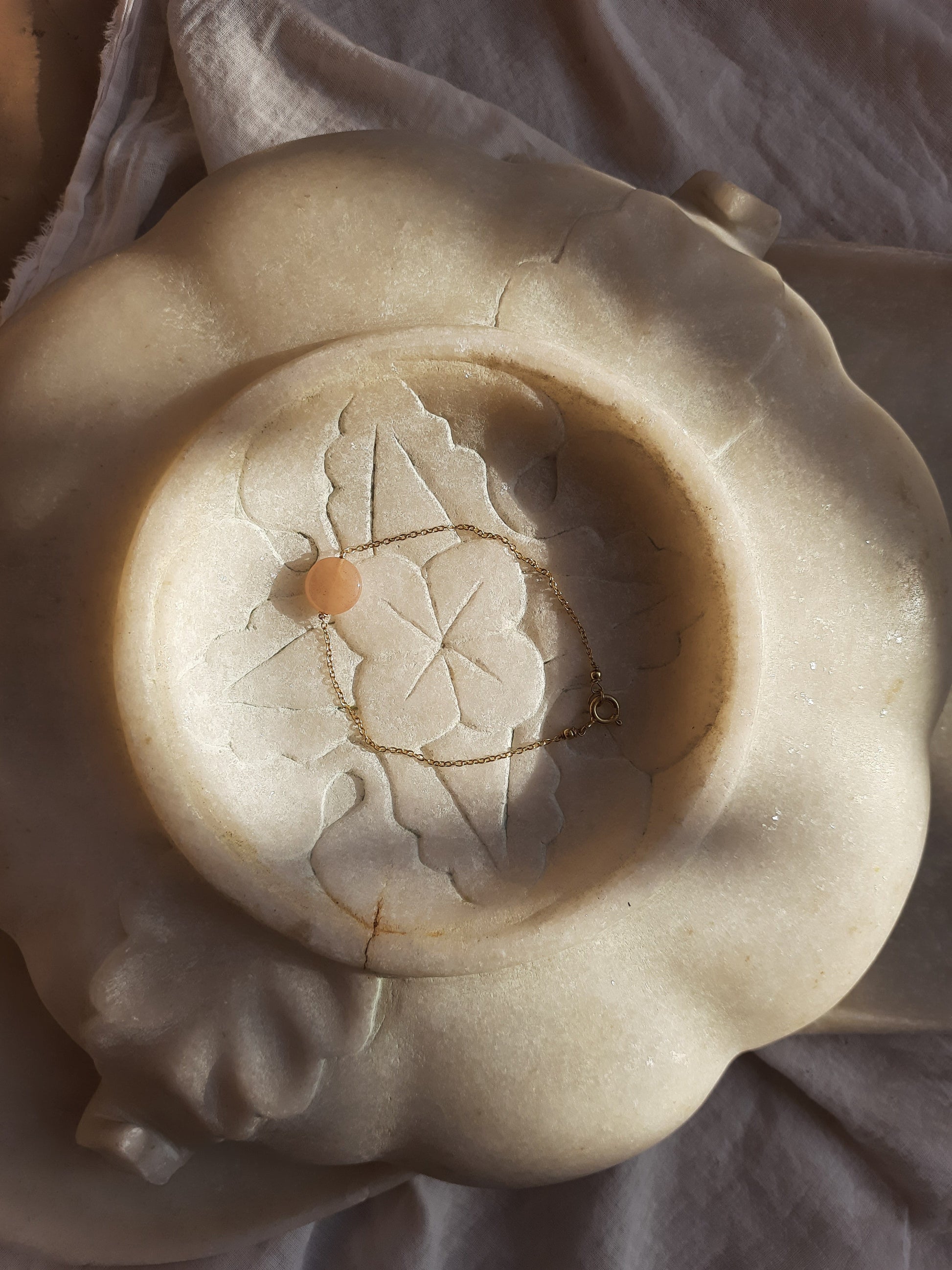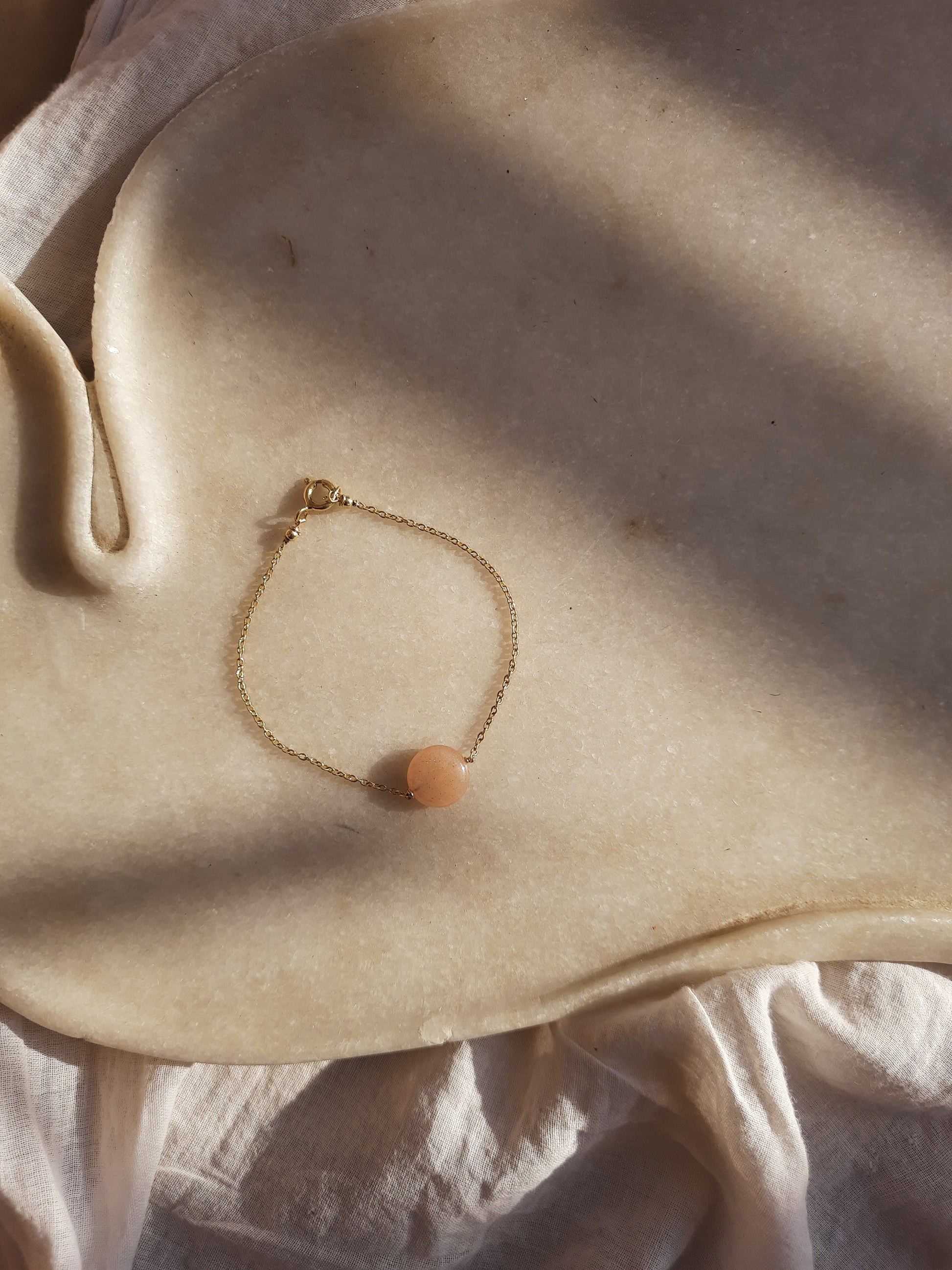 This bracelet is made from fine quality Peach moonstone gemstone, and was hand carved in a round shape and finished using 14kt Gold filled / Sterling Silver findings.