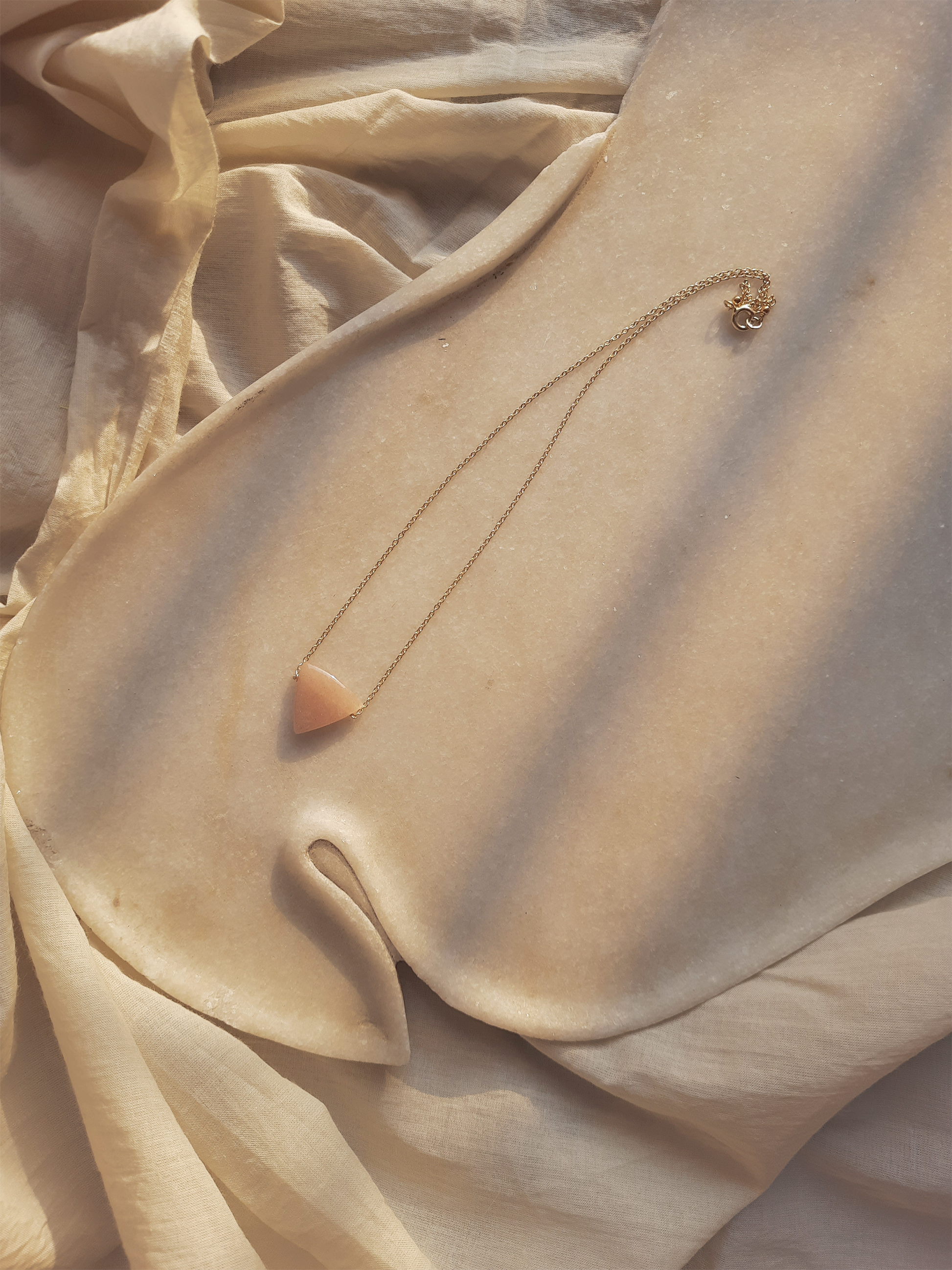 This pendant is made from fine quality Peach Moonstone gemstone, was hand carved in a triangle shape and finished using 14kt Gold Plated on Brass / Sterling Silver findings.