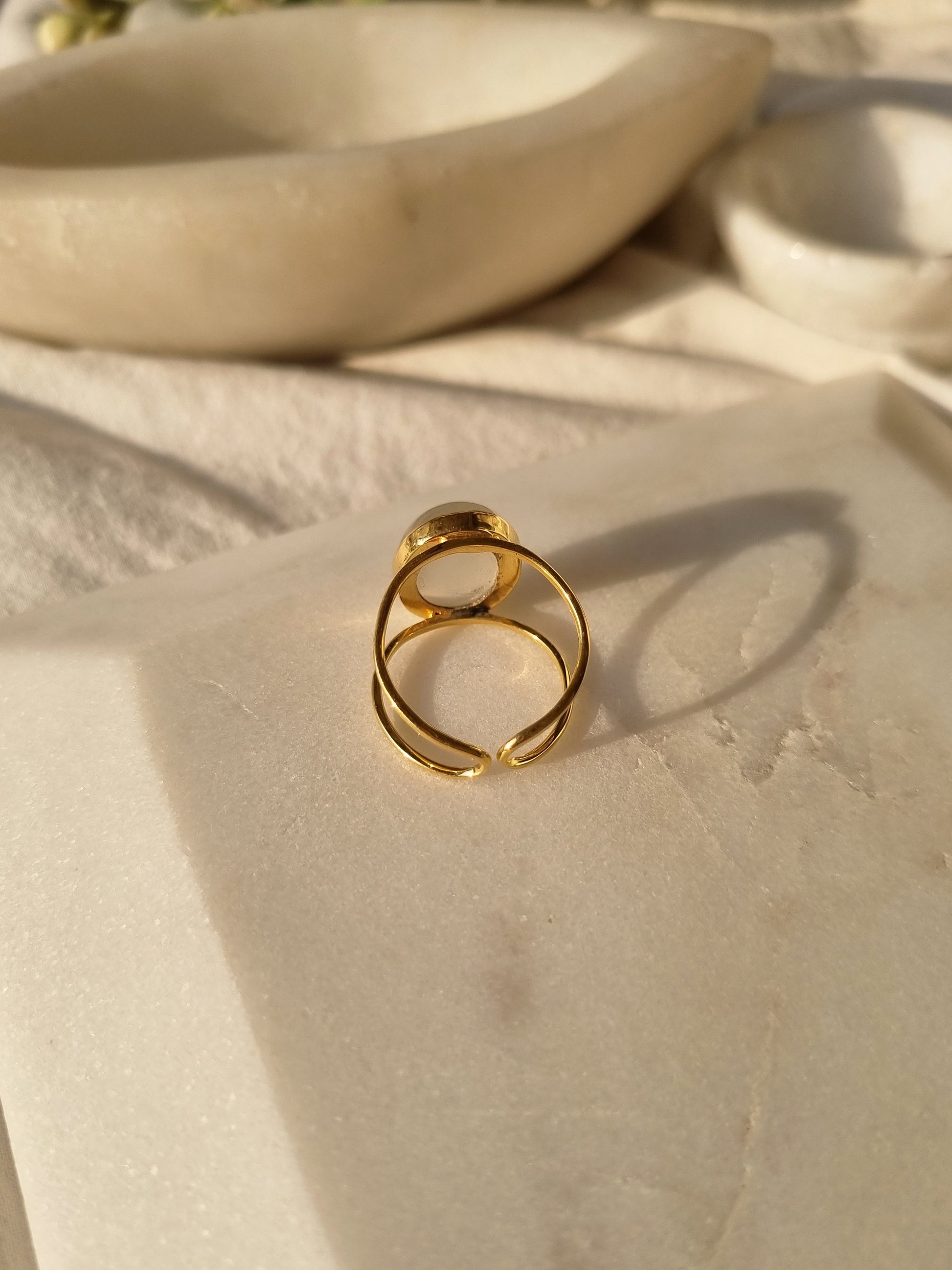 White Moonstone adjustable Olivia Ring finished with 14KT Gold Plated Brass.