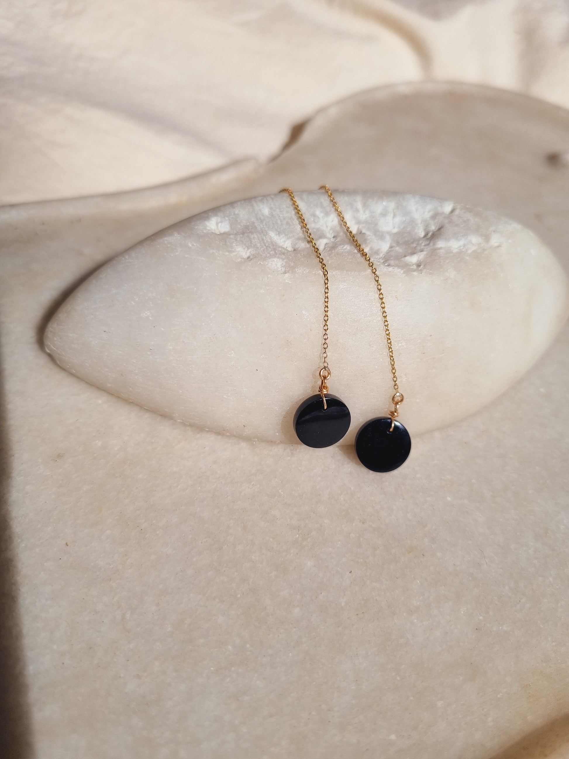 Black Onyx Coin Threader Earrings with 14kt Gold Plated on Brass/Sterling Silver chain.