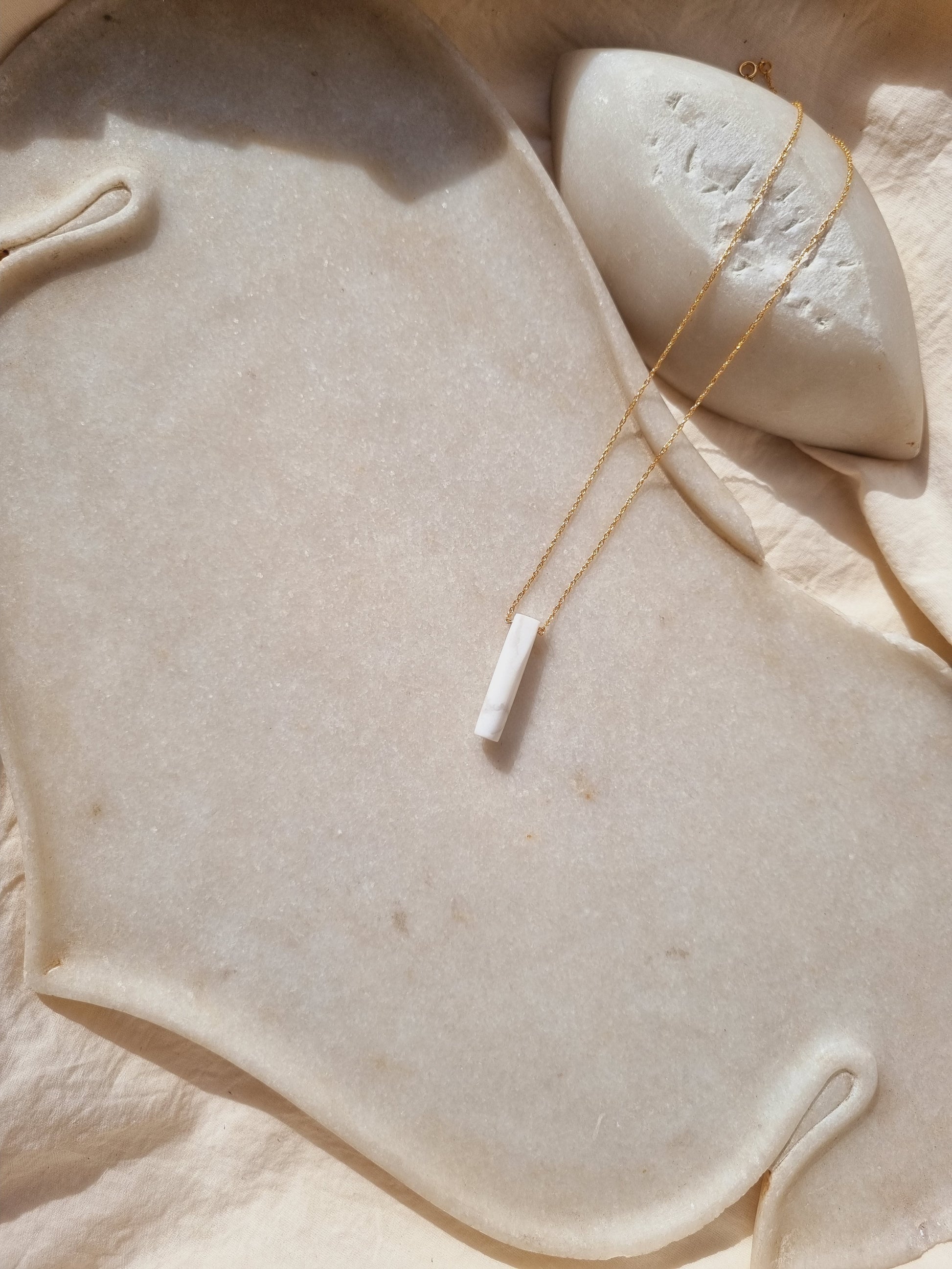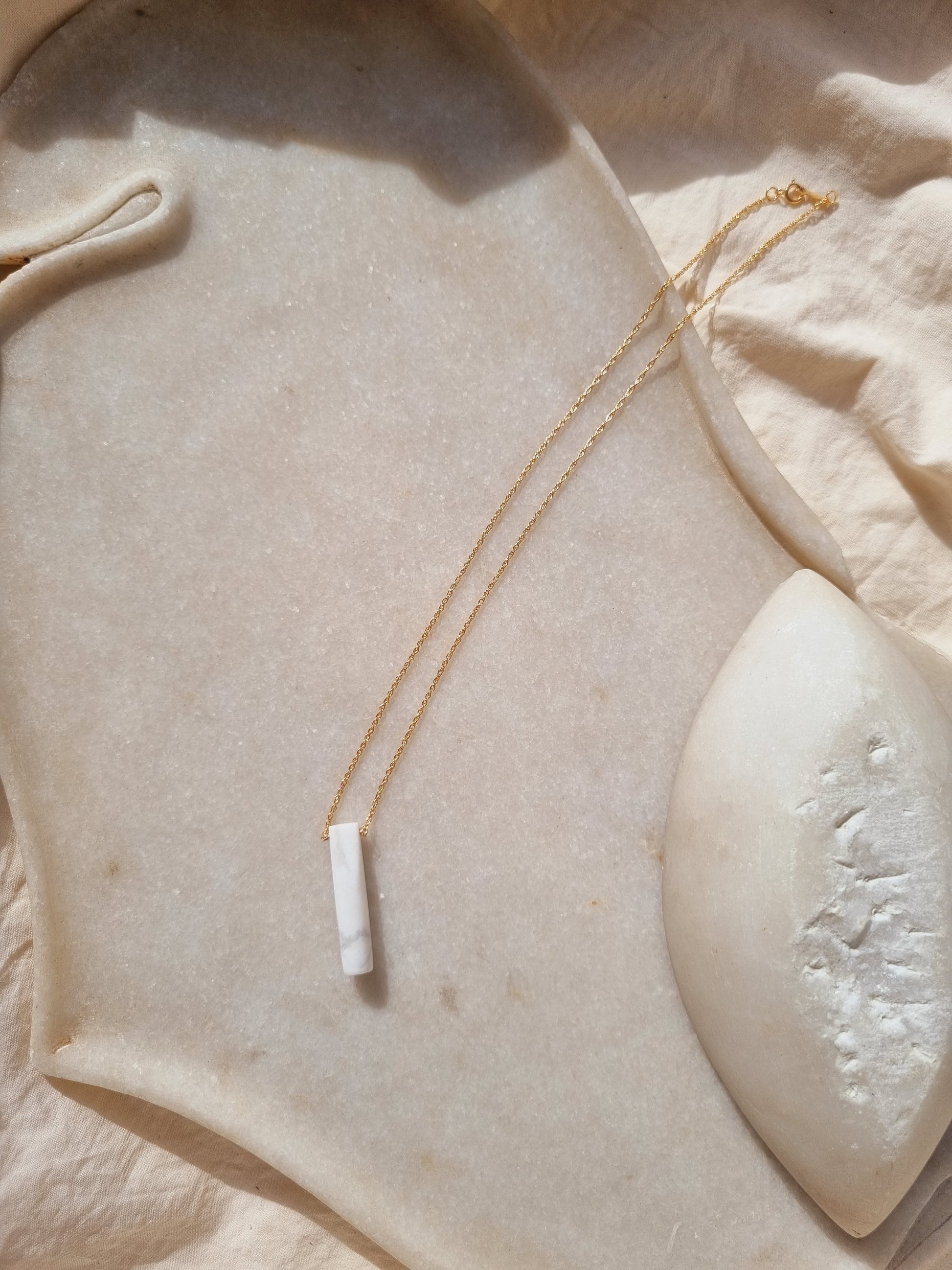 Howlite Barrel Pendant with 14kt Gold Plated on Brass/Sterling Silver chain.