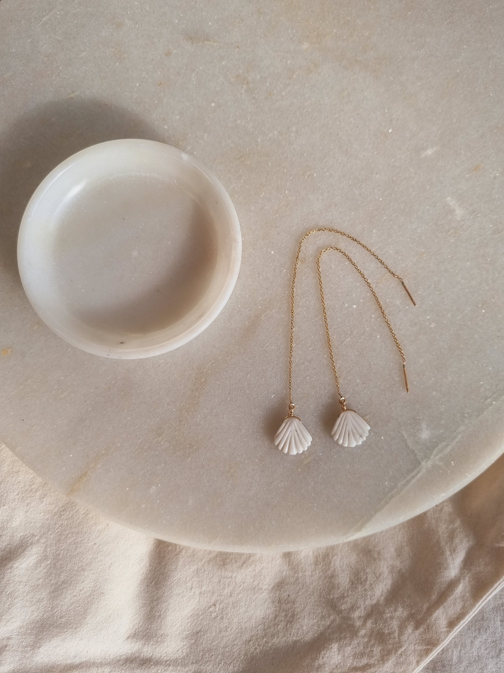 This crystal threader earrings is made from fine quality Howlite gemstone, was hand carved in a shell shaped stone and finished using 14kt Gold Plated on Brass / Sterling Silver findings.