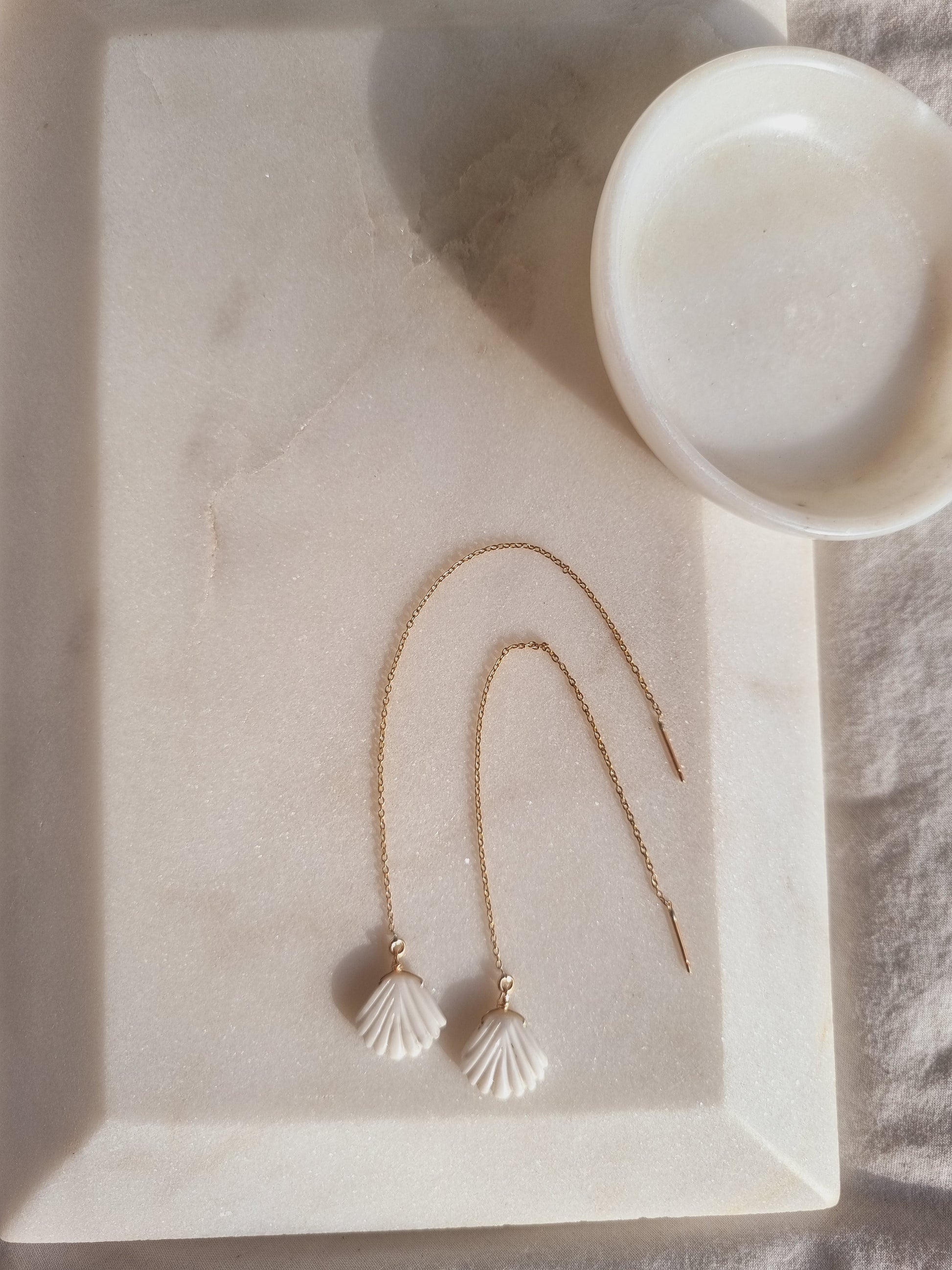 Howlite Shell Threader Earrings with 14kt Gold Plated on Brass/Sterling Silver chain.