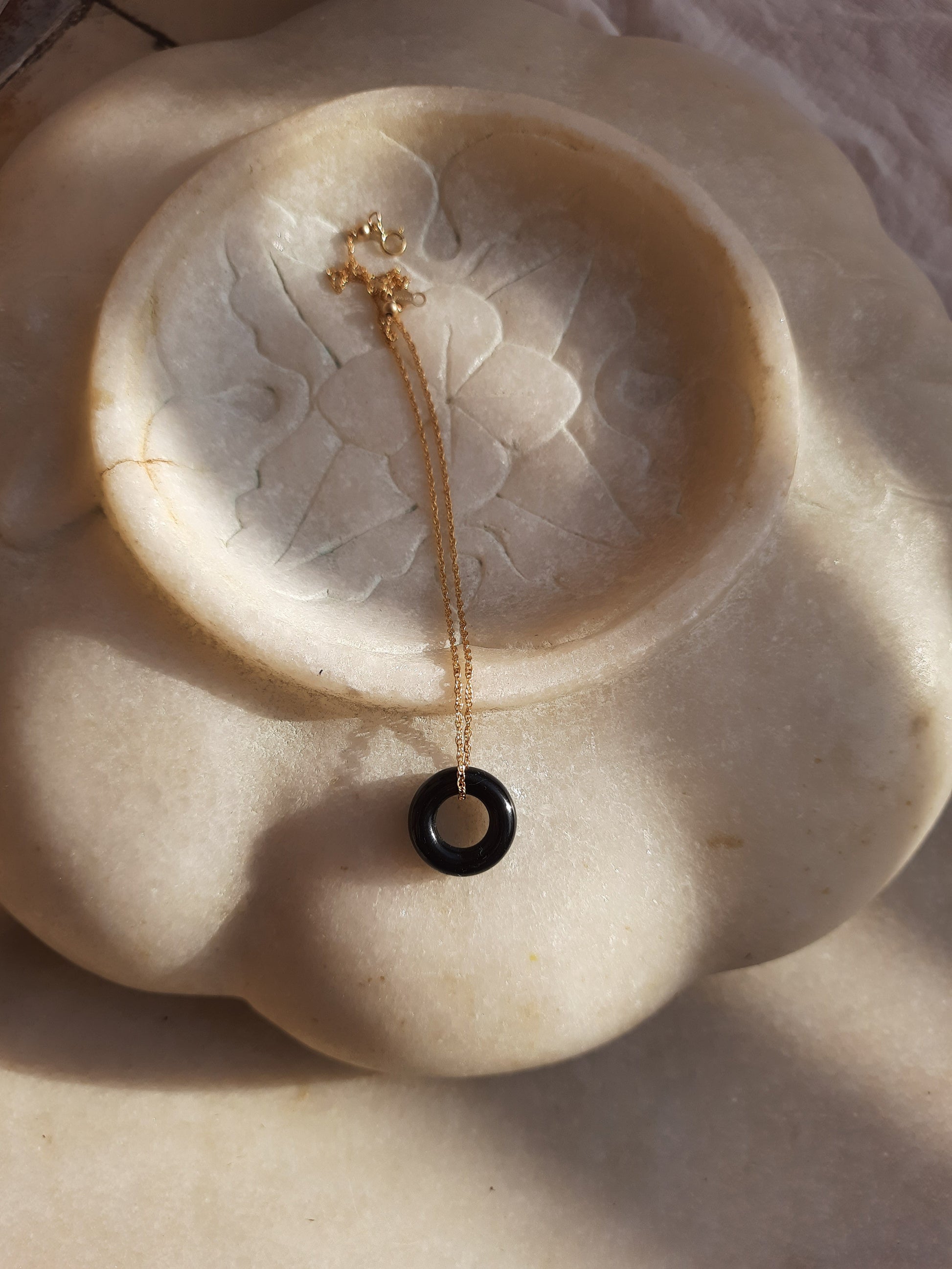 Black Onyx Donut Pendant with 14kt Gold Plated on Brass/Sterling Silver chain.