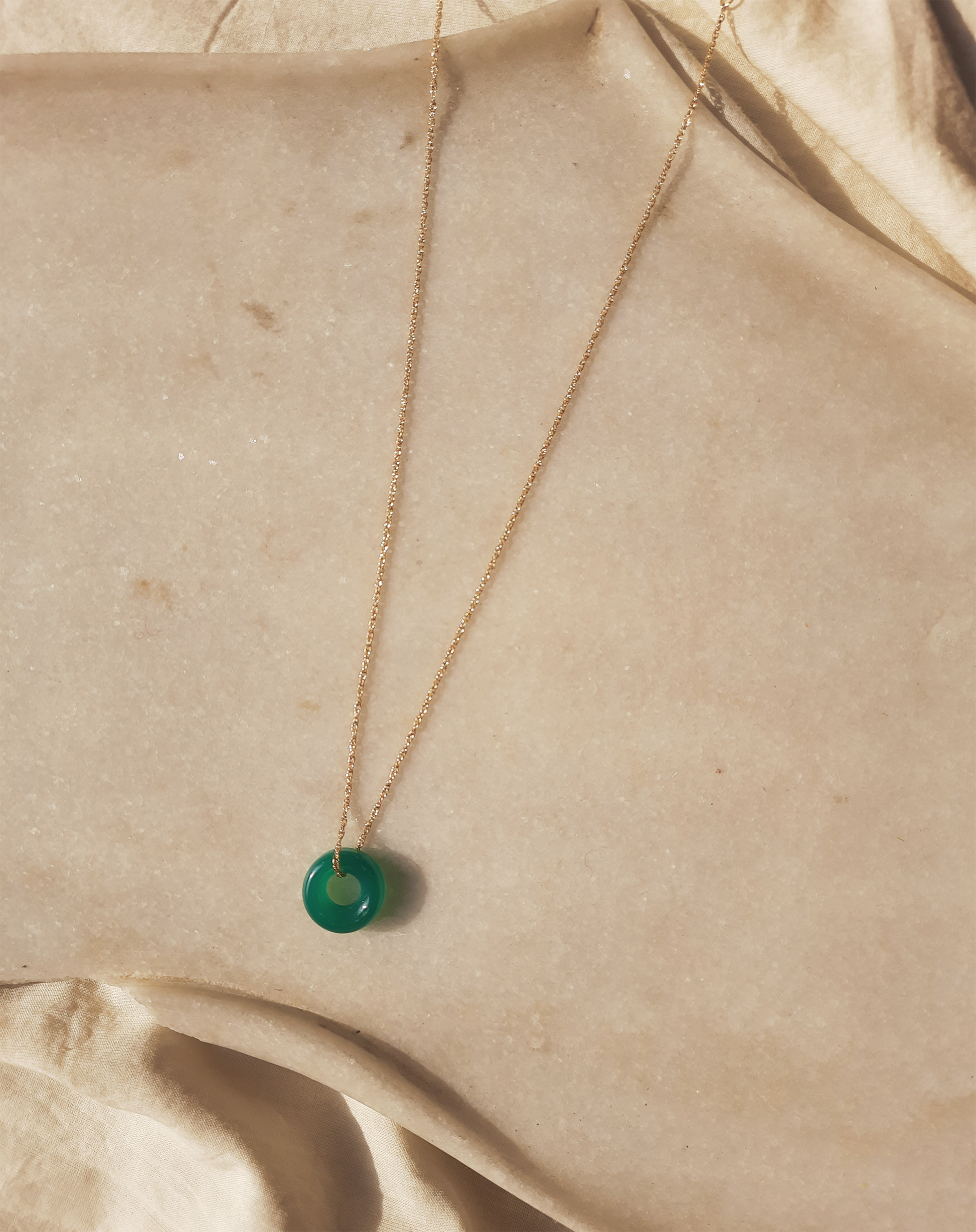 Green Onyx Donut Pendant with 14kt Gold Plated on Brass/Sterling Silver chain.