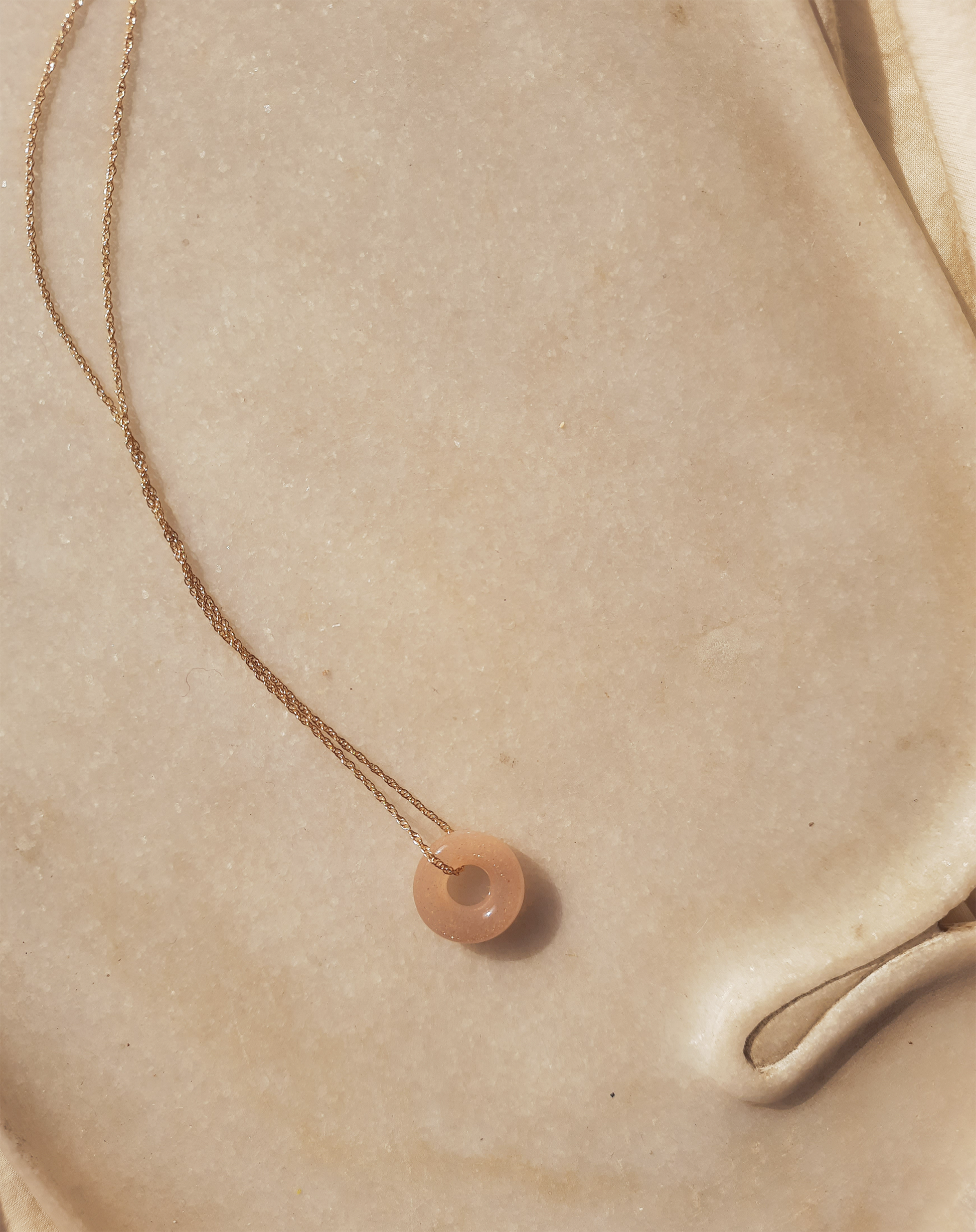 Peach Moonstone Donut Pendant with 14kt Gold Plated on Brass/Sterling Silver chain.