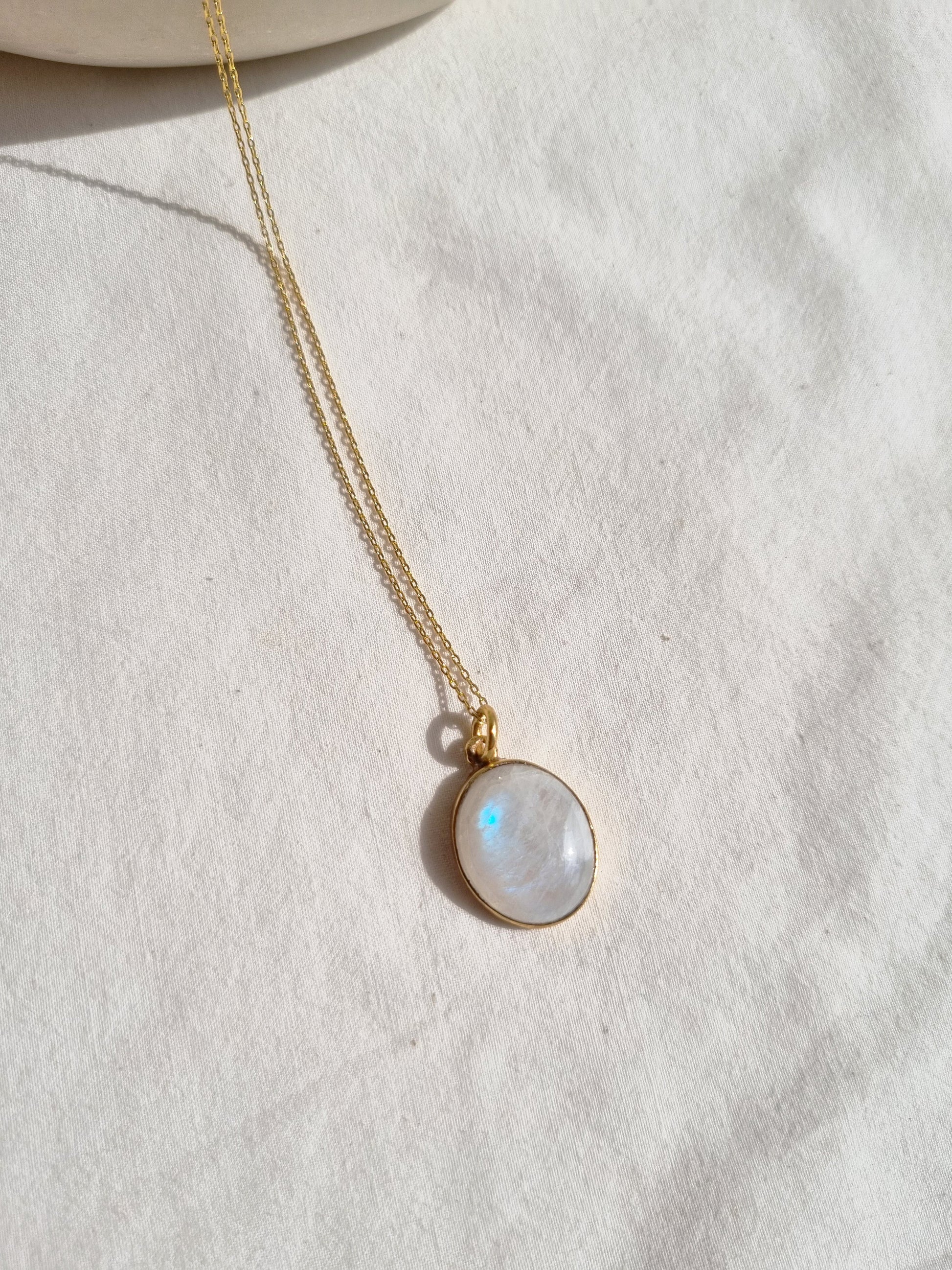 Rainbow Moonstone Oval Pendant with 14kt Gold Plated Brass chain.