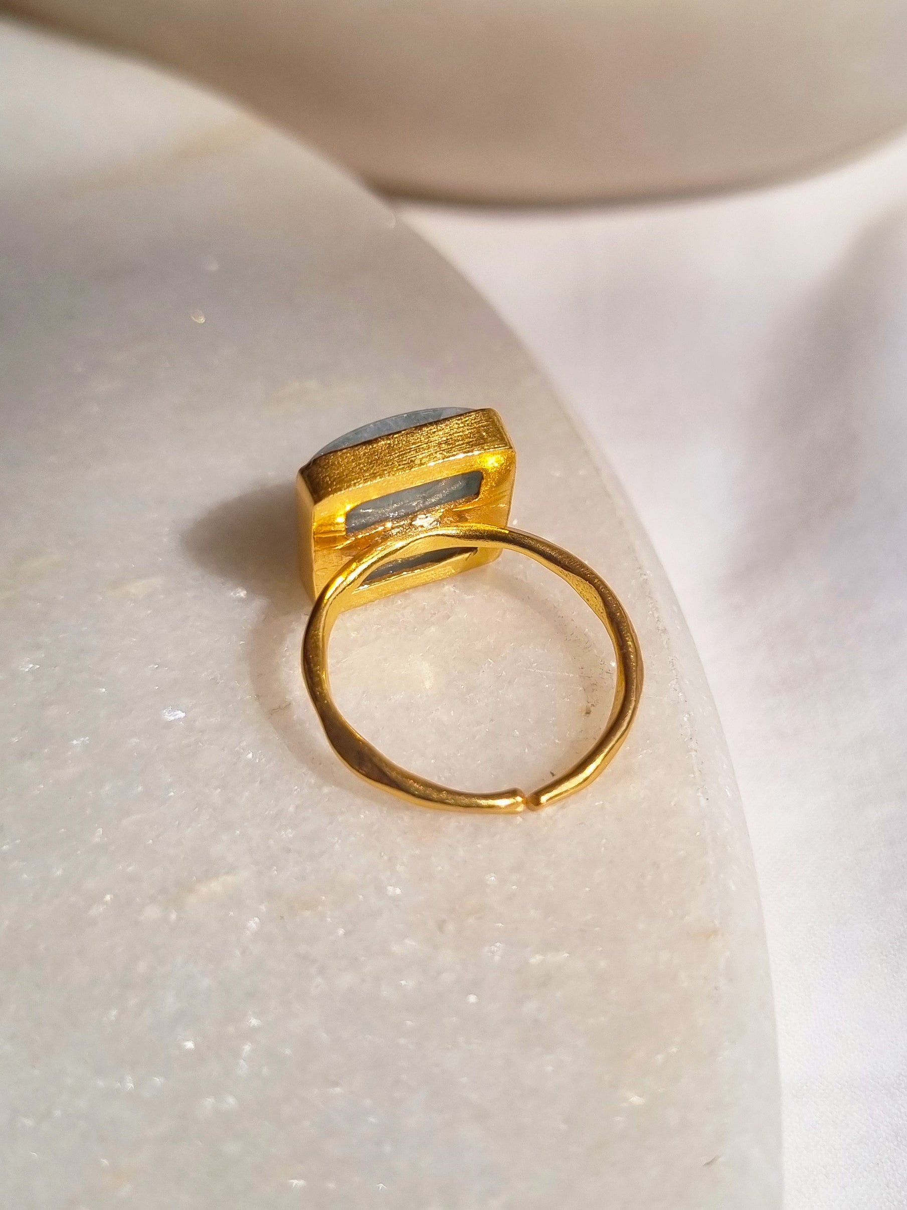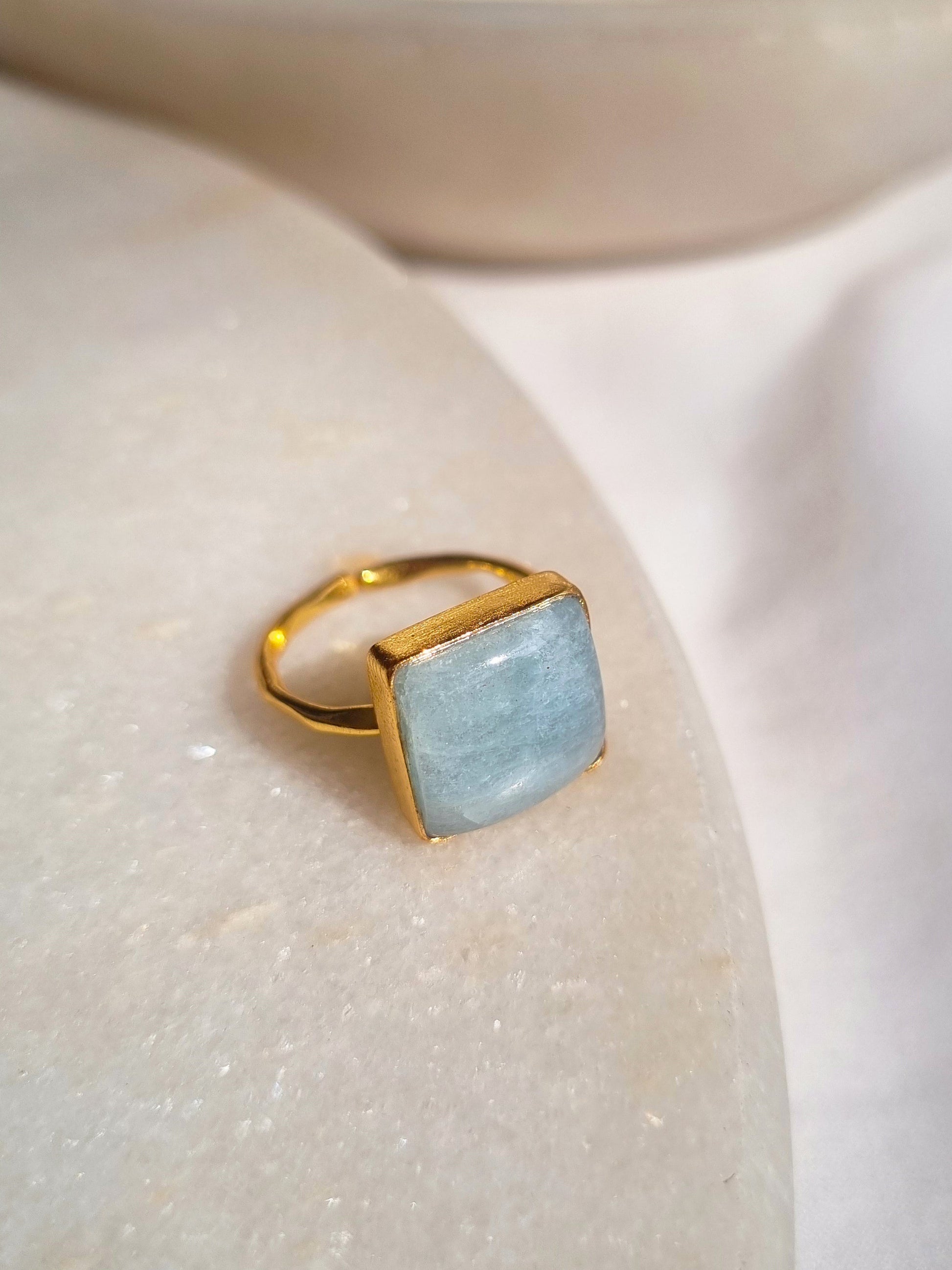 This crystal ring is made from fine quality Aquamarine gemstone, was hand carved in a square shape and finished using adjustable 14KT Gold plated brass.