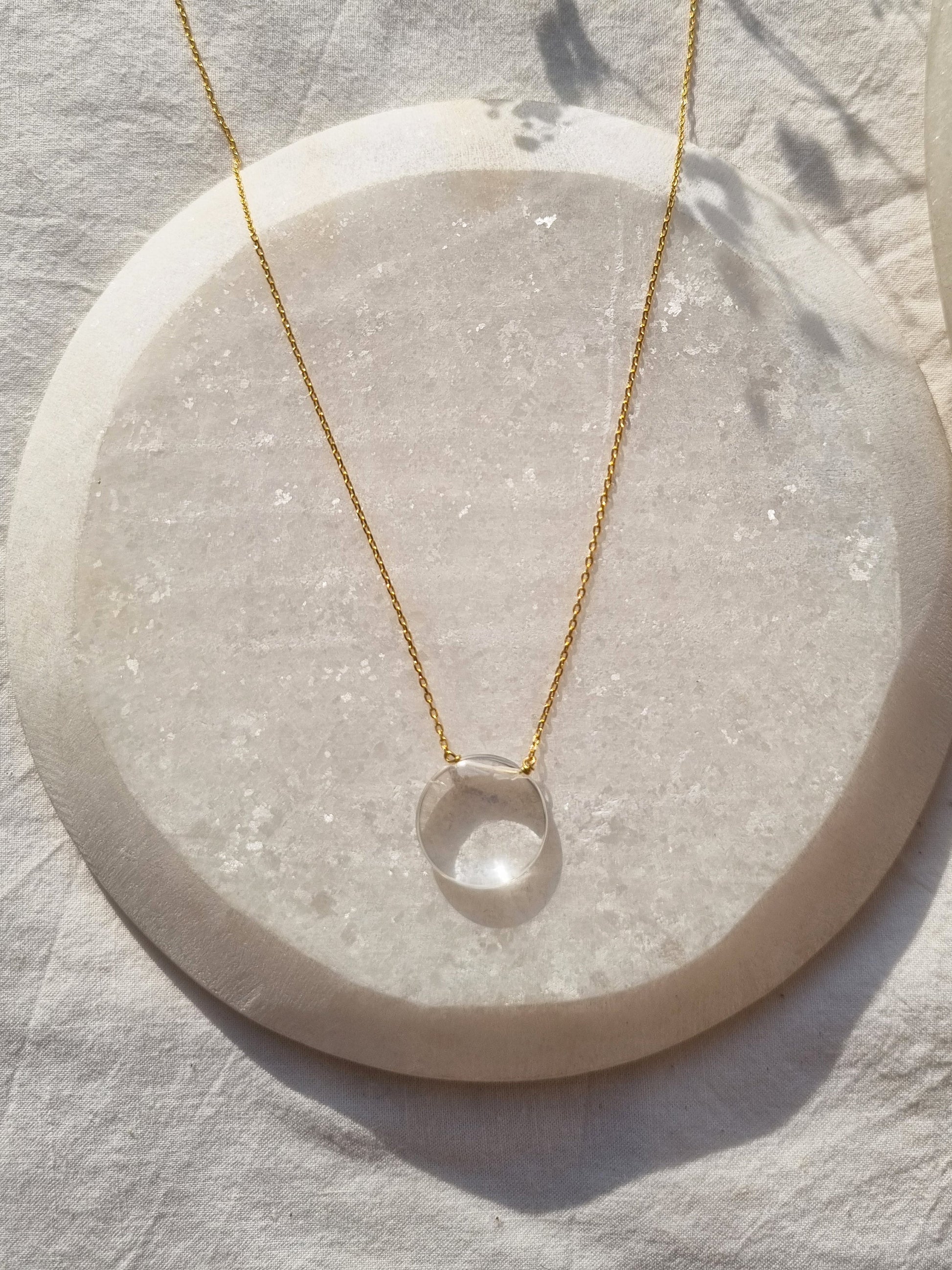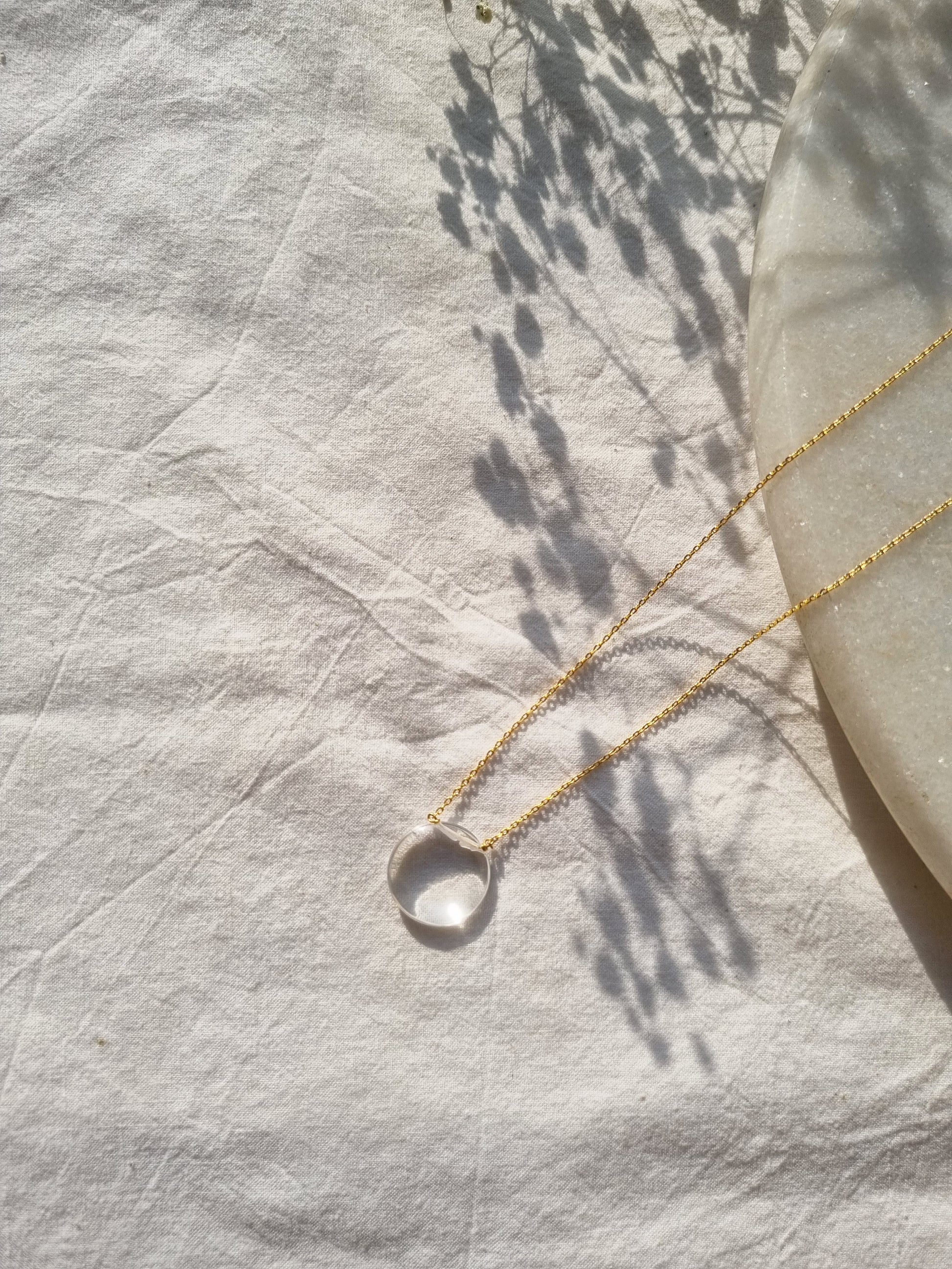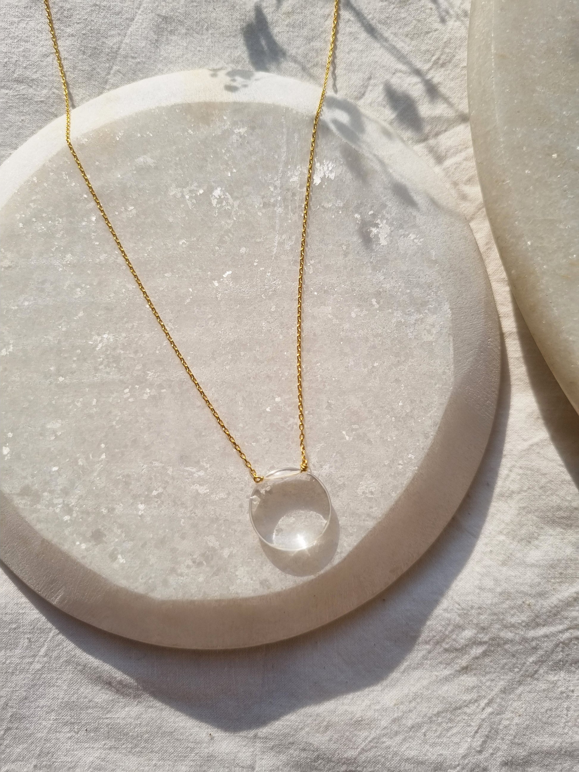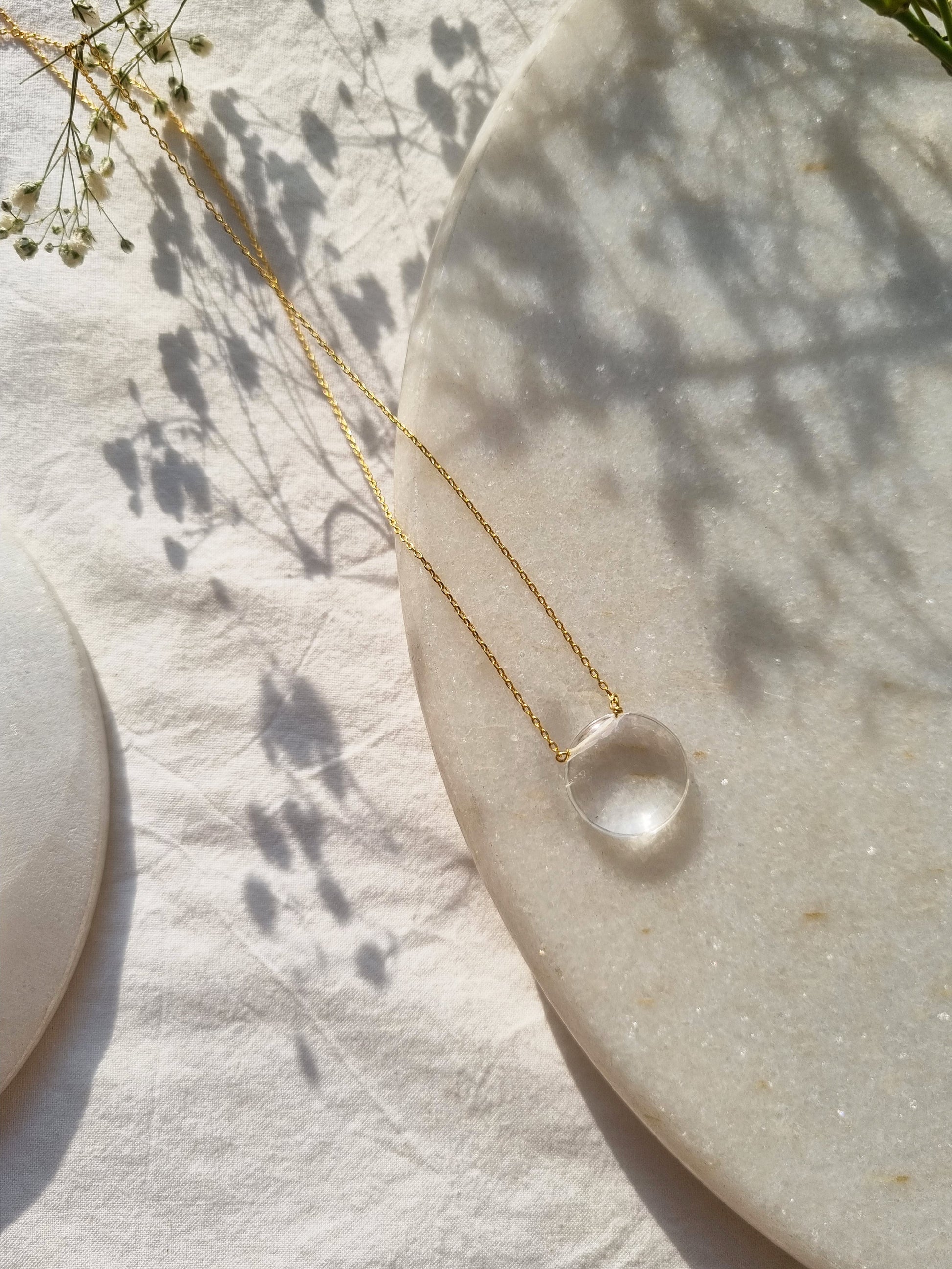 This crystal pendant is made from fine quality Clear Quartz gemstone, was hand carved in round shape and was finished using Sterling Silver / 14kt Gold Plated on Brass findings.