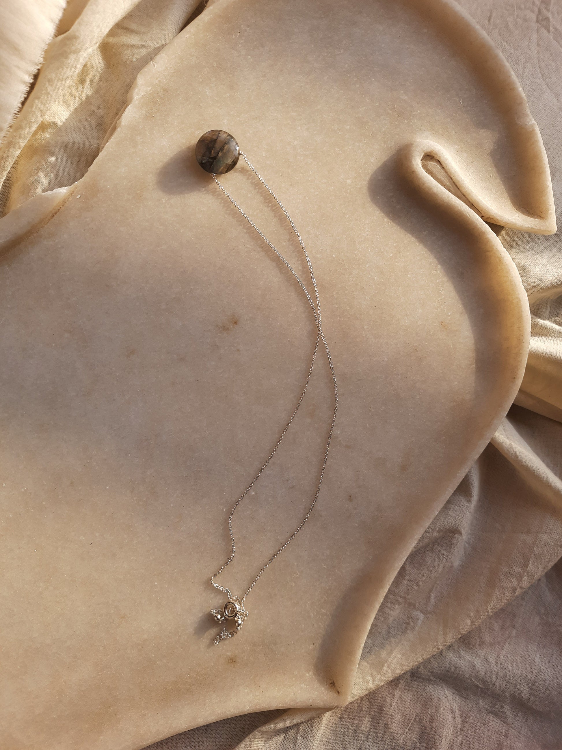 This crystal pendant is made from fine quality Labradorite gemstone, was hand carved in round shape and was finished using Sterling Silver / 14kt Gold Plated on Brass findings.