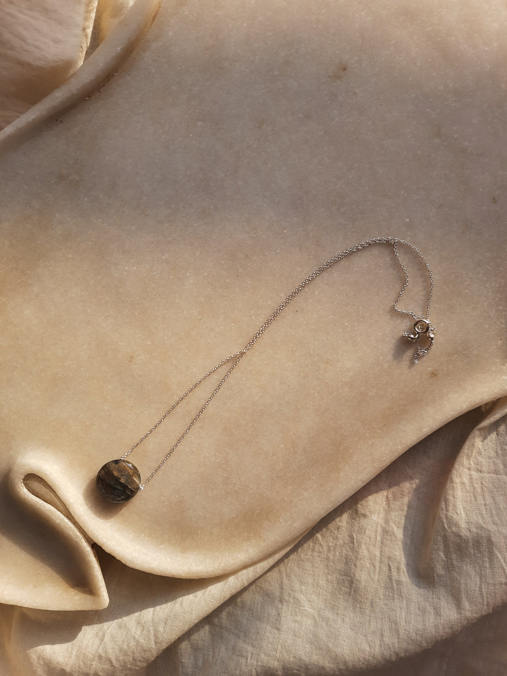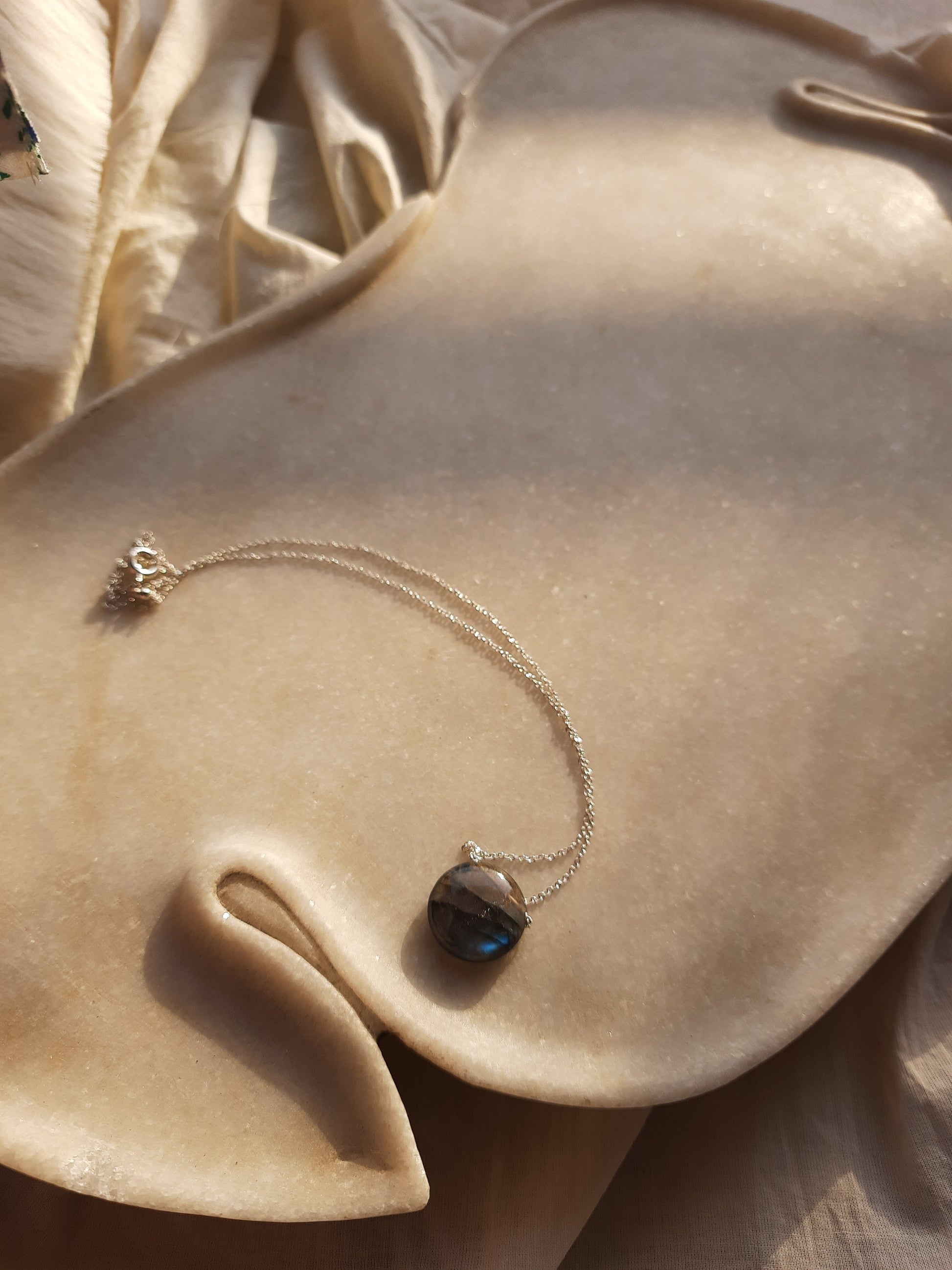 Labradorite Round Coin Pendant with Sterling Silver/14kt Gold Plated on Brass chain.